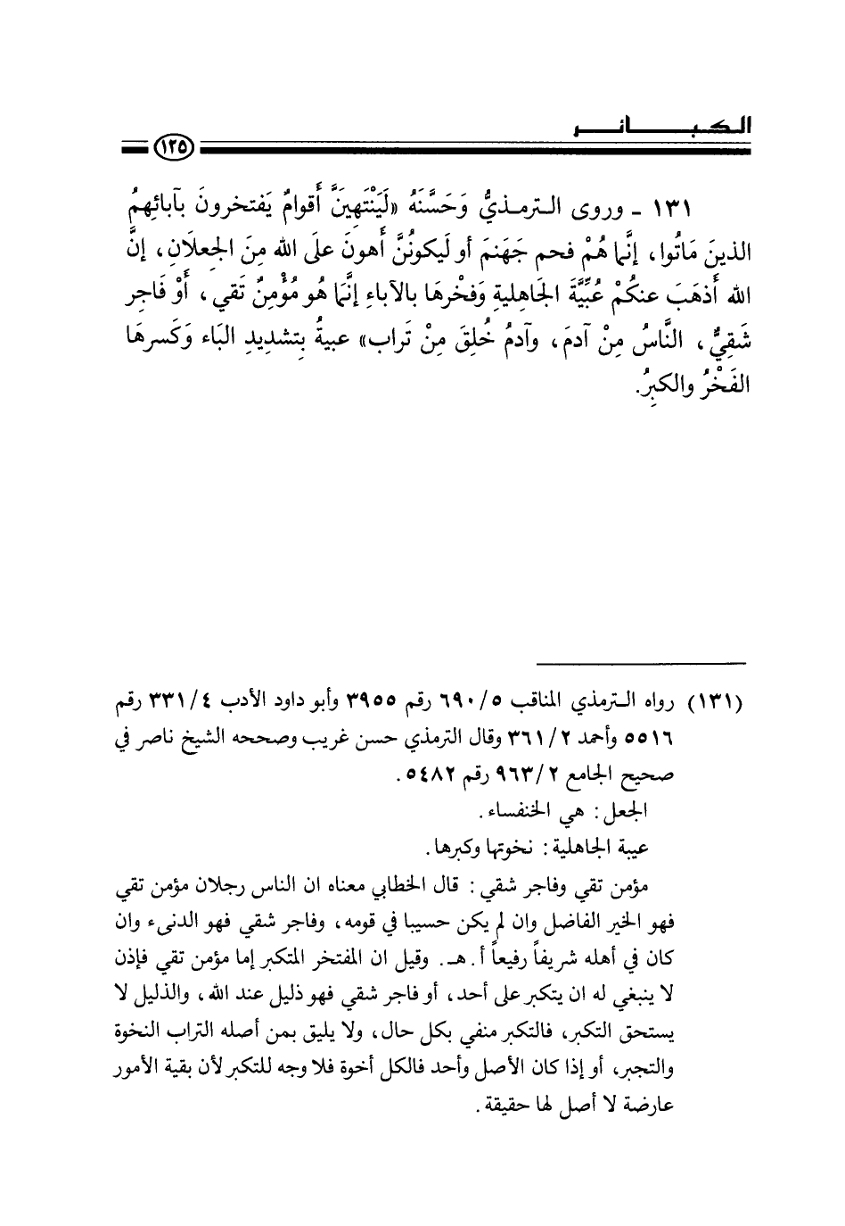 131 - وروى الترمذي وحسنه «لينتهين أقوام يفتخرون بآبائهم الذين ماتوا، إنما هم فحم جهنم أو ليكونن أهون على الله من الجعلان، إن الله أذهب عنكم عبية الجاهلية وفخرها بالآباء إنما هو مؤمن تقي، أو فاجر شقي، الناس من آدم، وآدم خلق من تراب» عبية بتشديد الباء وكسرها الفخر والكبر.