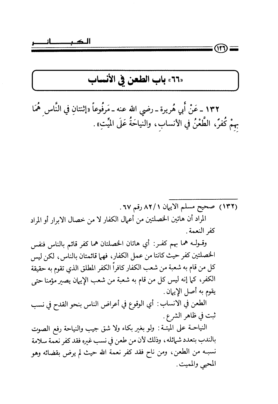 132 - عن أبي هريرة - رضي الله عنه - مرفوعا «اثنتان في الناس هما بهم كفر، الطعن في الأنساب، والنياحة على الميت» .