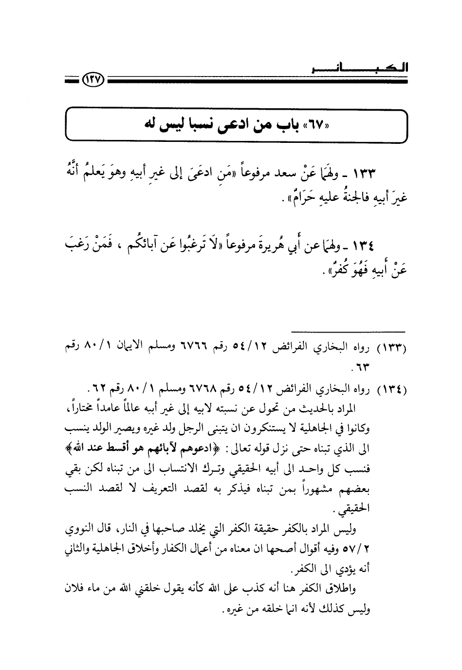(133) رواه البخاري الفرائض 12 / 54 رقم 6766 ومسلم الإيمان 1 / 80 رقم 63.