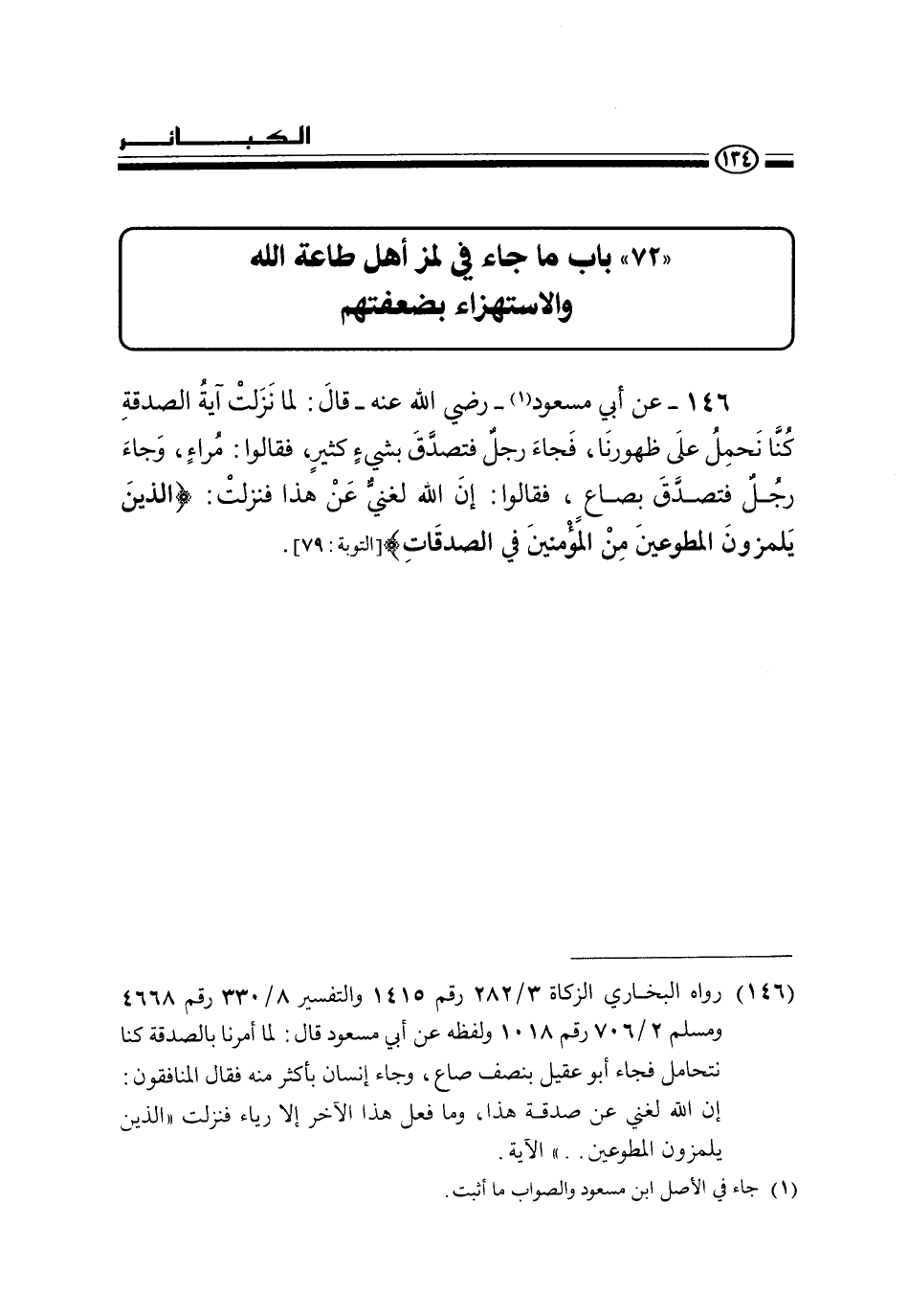 (146) رواه البخاري الزكاة 3 / 282 رقم 1415 والتفسير 8 / 330 رقم 4668 ومسلم 2 / 706 رقم 1018 ولفظه عن أبي مسعود قال: «لما أمرنا بالصدقة كنا نتحامل فجاء أبو عقيل بنصف صاع، وجاء إنسان بأكثر منه فقال المنافقون: إن الله لغني عن صدقة هذا، وما فعل هذا الآخر إلا رياء فنزلت {الَّذِينَ يَلْمِزُونَ الْمُطَّوِّعِينَ} » الآية.