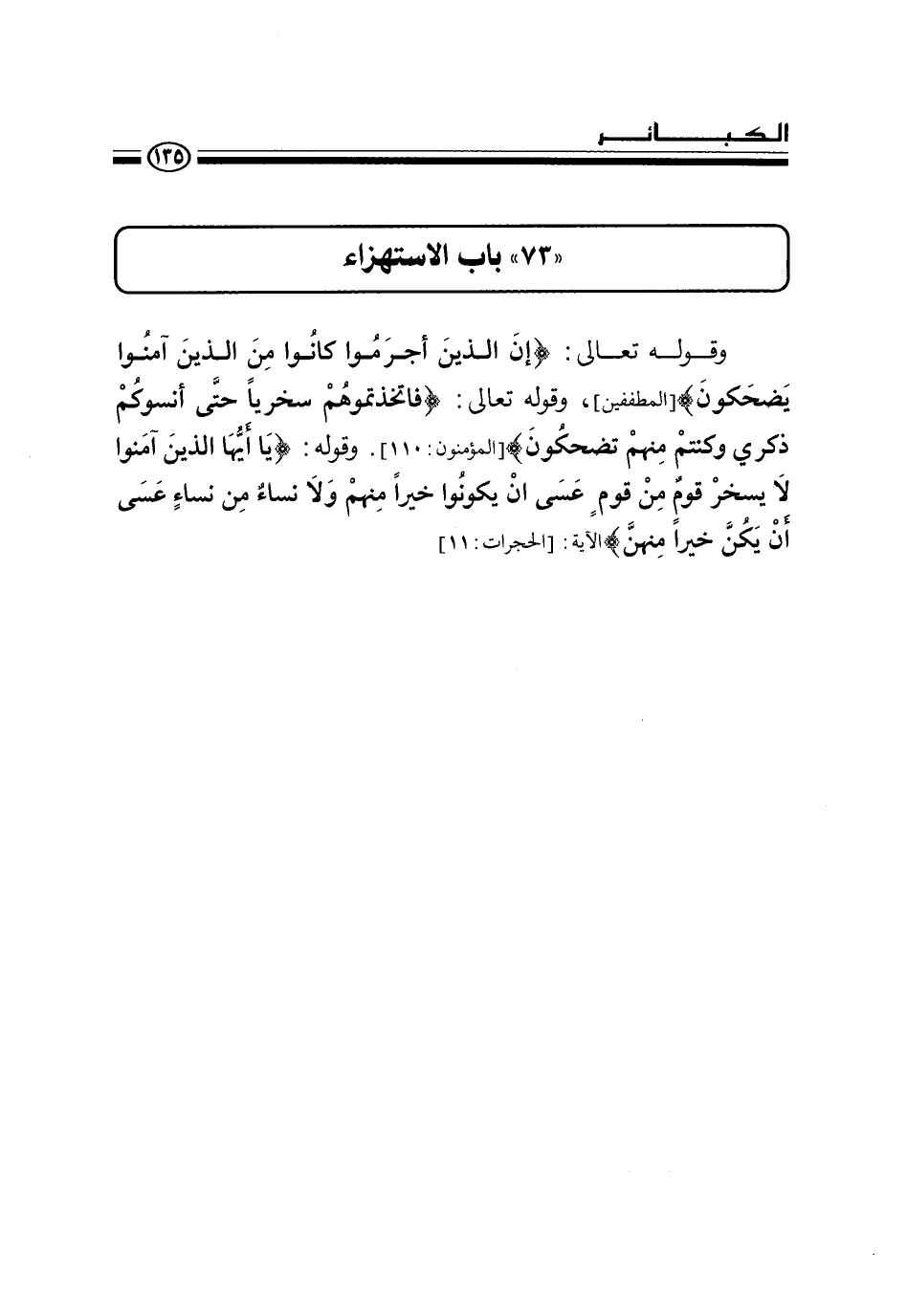 " 73 " باب الاستهزاء وقوله تعالى: {إِنَّ الَّذِينَ أَجْرَمُوا كَانُوا مِنَ الَّذِينَ آمَنُوا يَضْحَكُونَ} وقوله تعالى: {فَاتَّخَذْتُمُوهُمْ سِخْرِيًّا حَتَّى أَنْسَوْكُمْ ذِكْرِي وَكُنْتُمْ مِنْهُمْ تَضْحَكُونَ} وقوله: {يَا أَيُّهَا الَّذِينَ آمَنُوا لَا يَسْخَرْ قَومٌ مِنْ قَوْمٍ عَسَى أَنْ يَكُونُوا خَيْرًا مِنْهُمْ وَلَا نِسَاءٌ مِنْ نِسَاءٍ عَسَى أَنْ يَكُنَّ خَيْرًا مِنْهُنَّ} الآية: [الحجرات: 11] .