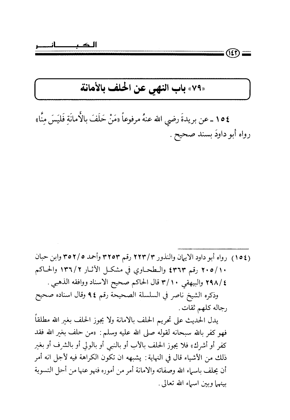 154 - عن بريدة رضي الله عنه مرفوعا «من حلف بالأمانة فليس منا» رواه أبو داود بسند صحيح.