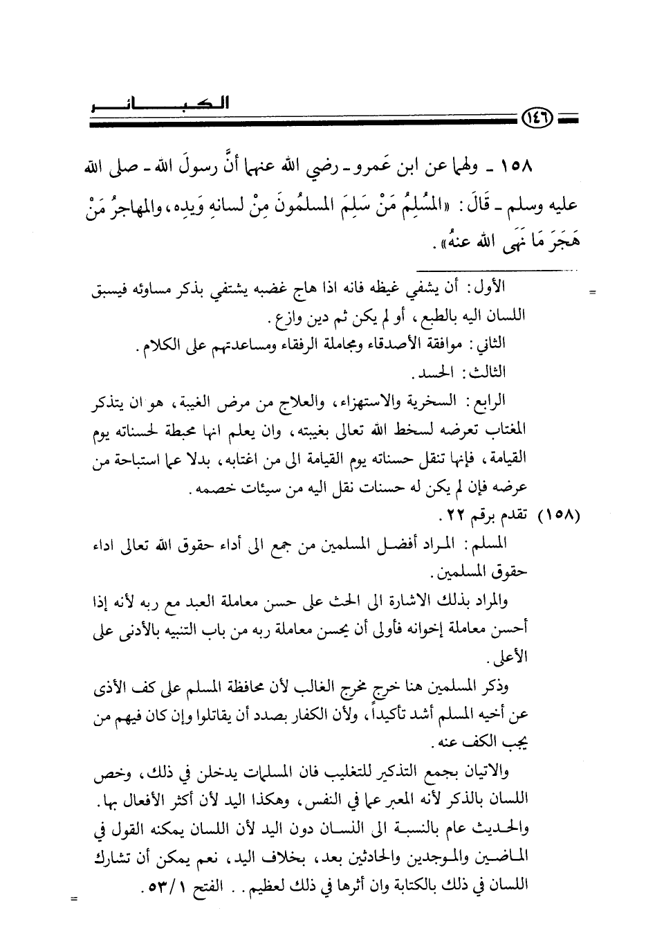 158 - ولهما عن ابن عمرو - رضي الله عنهما أن رسول الله - صلى الله عليه وسلم - قال: «المسلم من سلم المسلمون من لسانه ويده، والمهاجر من هجر ما نهى الله عنه» .