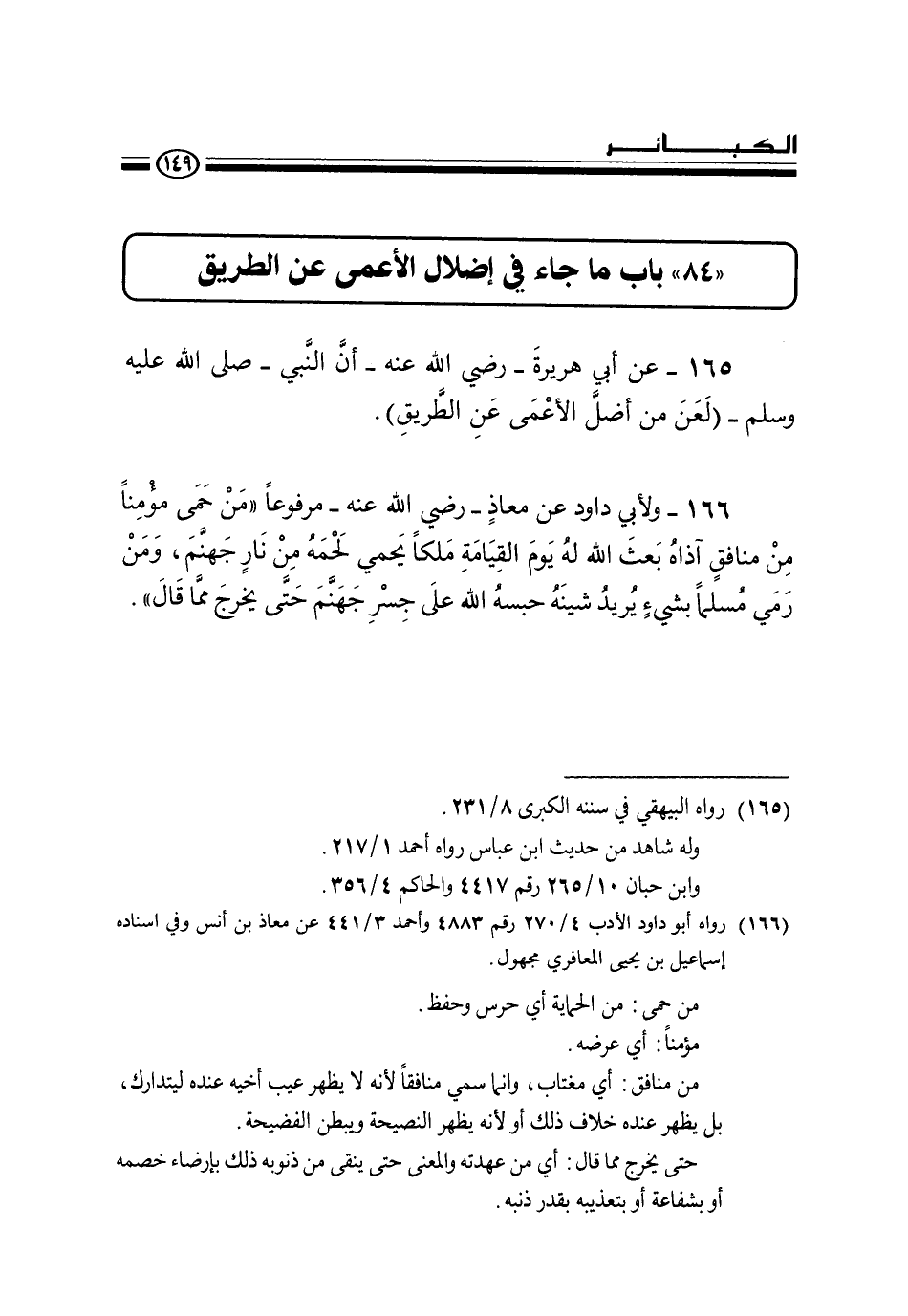 165 - عن أبي هريرة - رضي الله عنه - «أن النبي - صلى الله عليه وسلم - (لعن من أضل الأعمى عن الطريق) » .