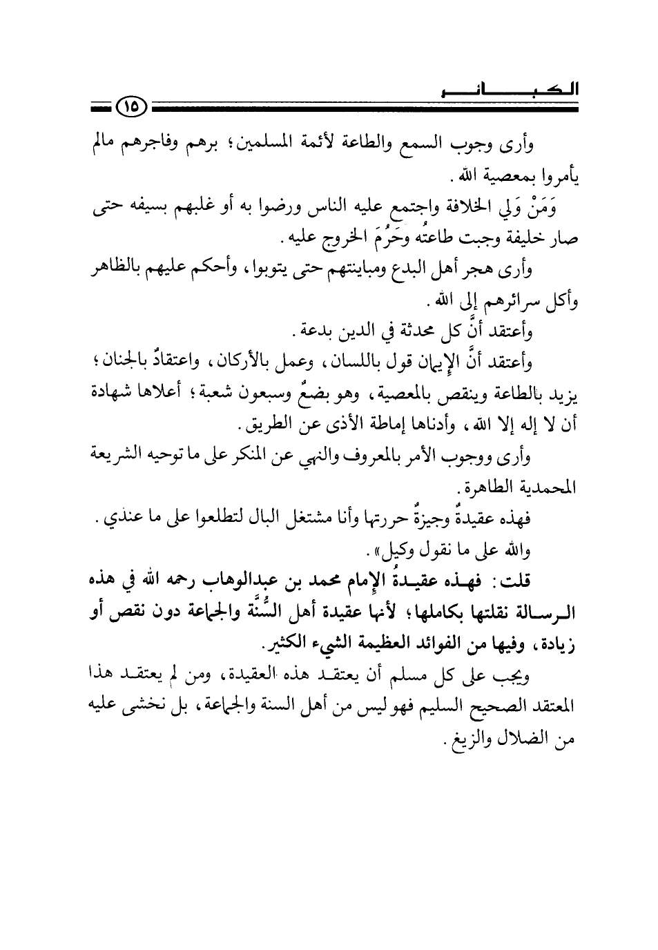 قلت: فهذه عقيدة الإمام محمد بن عبد الوهاب رحمه الله في هذه الرسالة نقلتها بكاملها؛ لأنها عقيدة أهل السنة والجماعة دون نقص أو زيادة، وفيها من الفوائد العظيمة الشيء الكثير.
