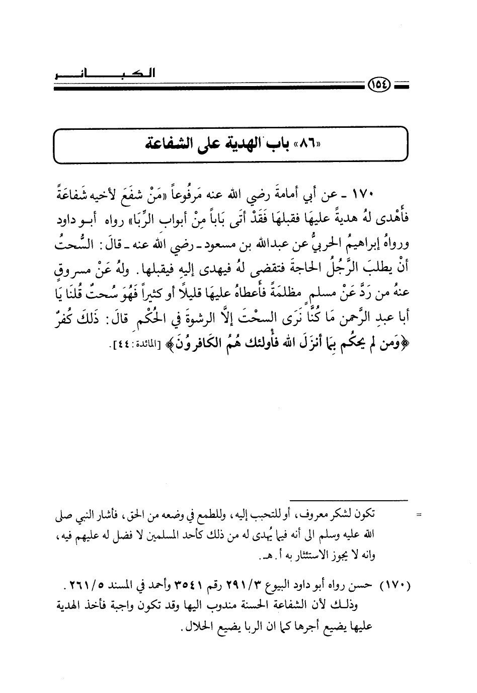 170 - عن أبي أمامة رضي الله عنه مرفوعا، «من شفع لأخيه شفاعة فأهدى له هدية عليها فقبلها فقد أتى بابا من أبواب الربا» رواه أبو داود ورواه إبراهيم الحربي عن عبد الله بن مسعود - رضي الله عنه - قال: السحت أن يطلب الرجل الحاجة فتقضى له فيهدي إليه فيقبلها. وله عن مسروق عنه من رد عن مسلم مظلمة فأعطاه عليها قليلا أو كثيرا فهو سحت قلنا يا أبا عبد الرحمن ما كنا نرى السحت إلا الرشوة في الحكم قال: ذلك كفر {وَمَنْ لَمْ يَحْكُمْ بِمَا أَنْزَلَ اللَّهُ فَأُولَئِكَ هُمُ الْكَافِرُونَ}