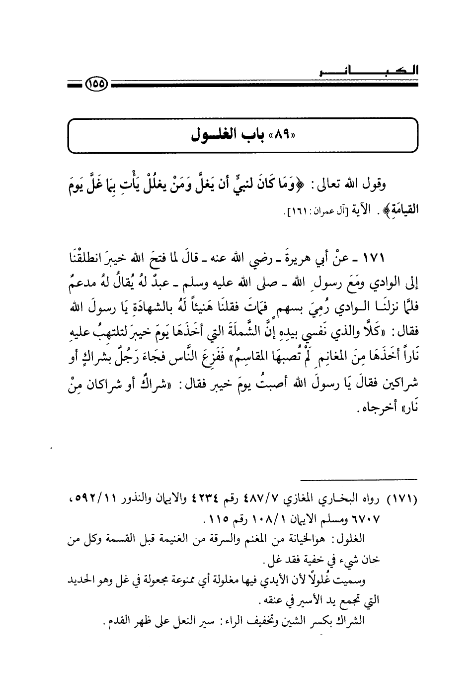 171 - عن أبي هريرة - رضي الله عنه - قال «لما فتح الله خيبر انطلقنا إلى الوادي ومع رسول الله - صلى الله عليه وسلم - عبد له يقال له مدعم فلما نزلنا الوادي رمي بسهم فمات فقلنا هنيئا له بالشهادة يا رسول الله فقال: " كلا والذي نفسي بيده إن الشملة التي أخذها يوم خيبر لتلتهب عليه نارا أخذها من المغانم لم تصبها المقاسم " ففزع الناس فجاء رجل بشراك أو شراكين فقال يا رسول الله أصبت يوم خيبر فقال: " شراك أو شراكان من نار» أخرجاه.