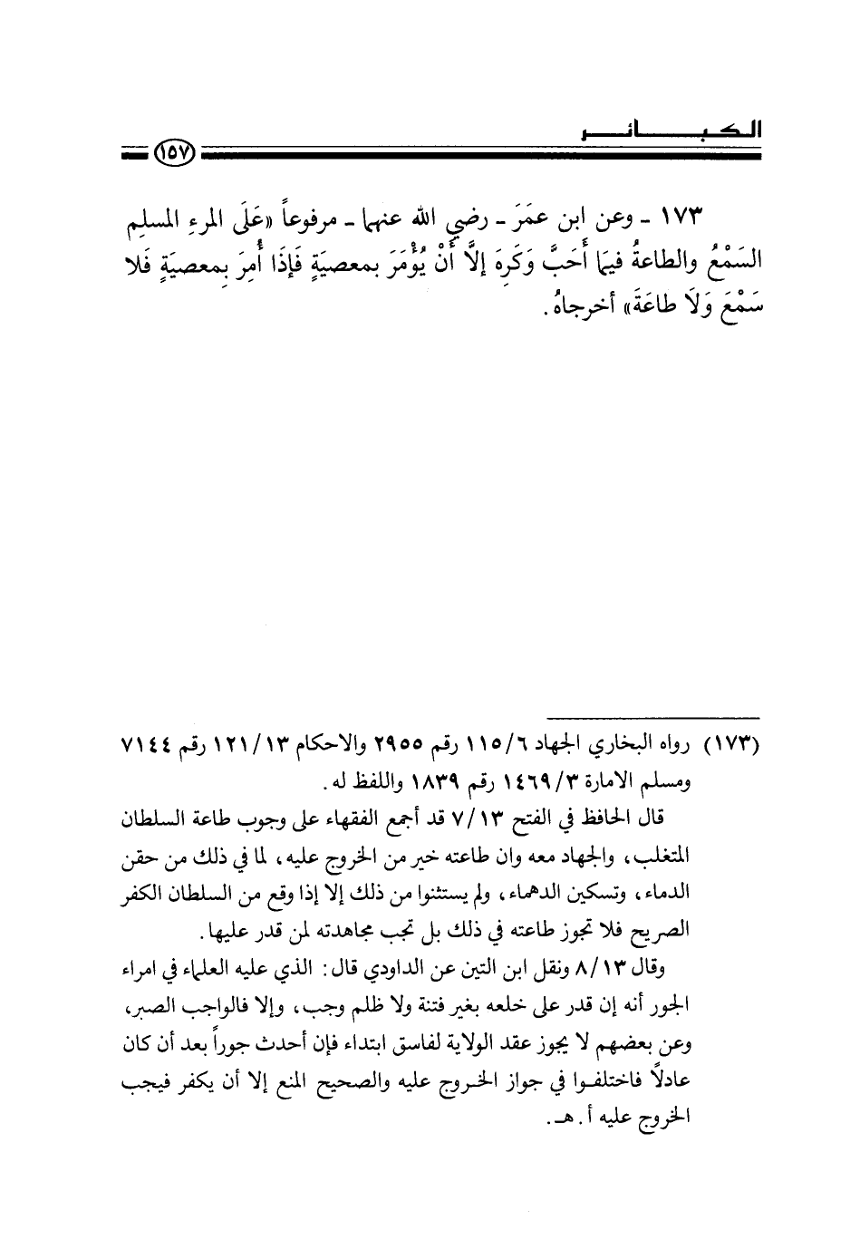 (173) رواه البخاري الجهاد 6 / 115 رقم 2955 والأحكام 13 / 121 رقم 7144 ومسلم الإمارة 3 / 1469 رقم 1839 واللفظ له.