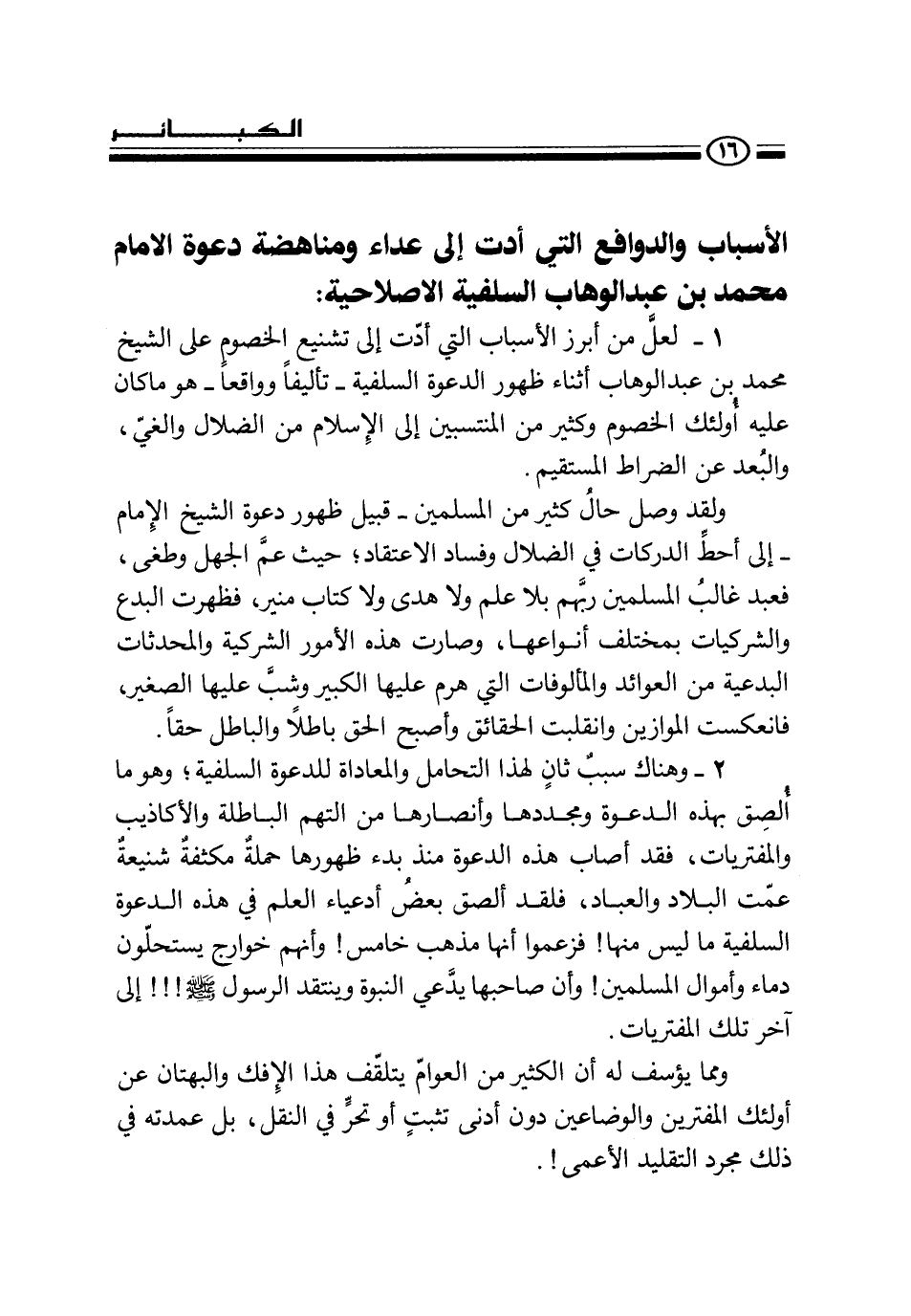 الأسباب والدوافع التي أدت إلى عداء ومناهضة دعوة الإمام محمد بن عبد الوهاب السلفية الإصلاحية: 1 - لعل من أبرز الأسباب التي أدت إلى تشنيع الخصوم على الشيخ محمد بن عبد الوهاب أثناء ظهور الدعوة السلفية - تأليفا وواقعا - هو ما كان عليه أولئك الخصوم وكثير من المنتسبين إلى الإسلام من الضلال والغي، والبعد عن الصراط المستقيم.