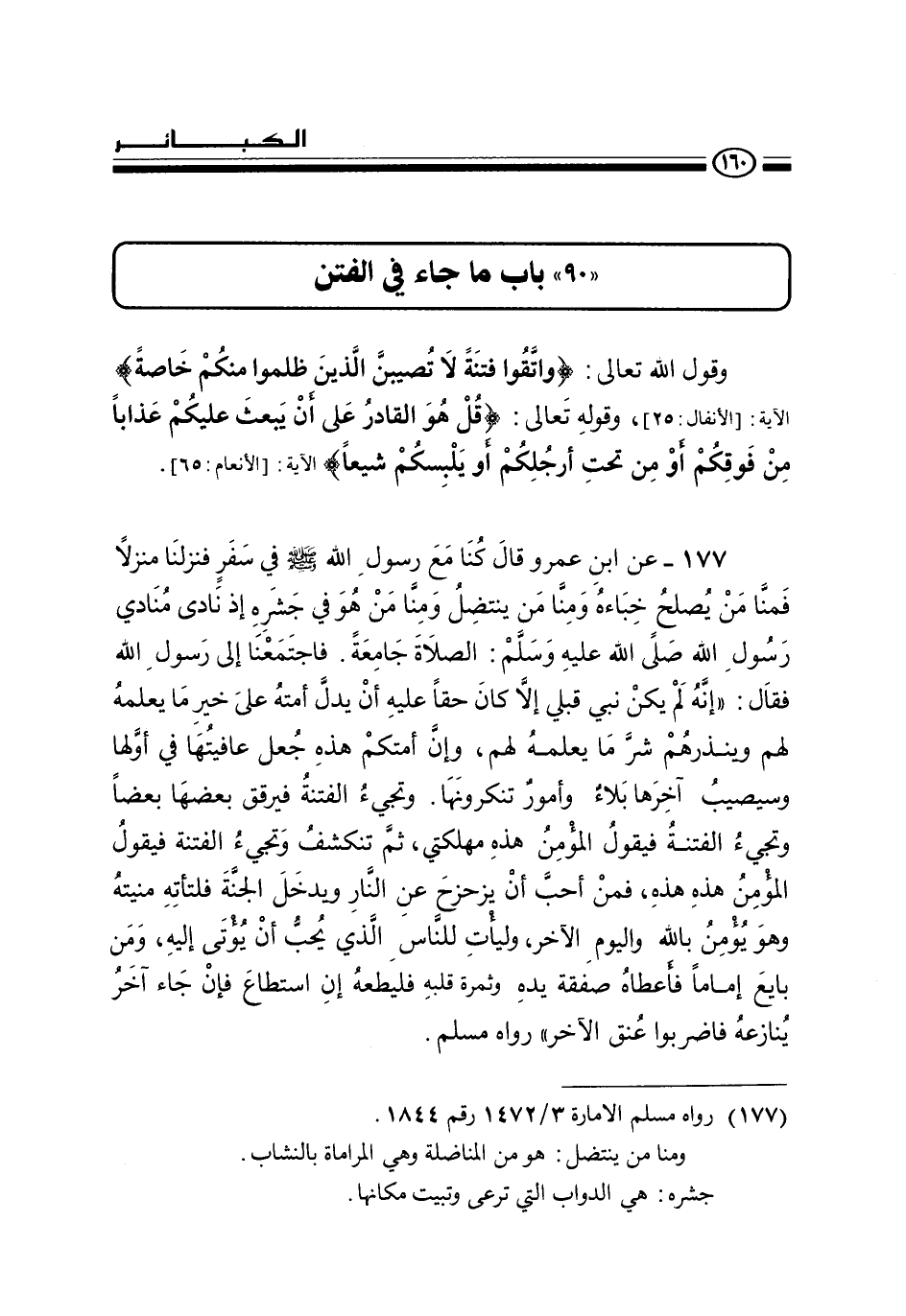177 - عن ابن عمرو قال «كنا مع رسول الله صلى الله عليه وسلم في سفر فنزلنا منزلا فمنا من يصلح خباءه ومنا من ينتضل ومنا من هو في جشره إذ نادى منادي رسول الله صلى الله عليه وسلم: الصلاة جامعة. فاجتمعنا إلى رسول الله فقال: " إنه لم يكن نبي قبلي إلا كان حقا عليه أن يدل أمته على خير ما يعلمه لهم وينذرهم شر ما يعلمه لهم، وإن أمتكم هذه جعل عافيتها في أولها وسيصيب آخرها بلاء وأمور تنكرونها. وتجيء الفتنة فيرقق بعضها بعضا وتجيء الفتنة فيقول المؤمن هذه مهلكتي، ثم تنكشف وتجيء الفتنة فيقول المؤمن هذه هذه، فمن أحب أن يزحزح عن النار ويدخل الجنة فلتأته منيته وهو يؤمن بالله واليوم الآخر، وليأت للناس الذي يحب أن يؤتى إليه، ومن بايع إماما فأعطاه صفقة يده وثمرة قلبه فليطعه إن استطاع فإن جاء آخر ينازعه فاضربوا عنق الآخر» رواه مسلم.