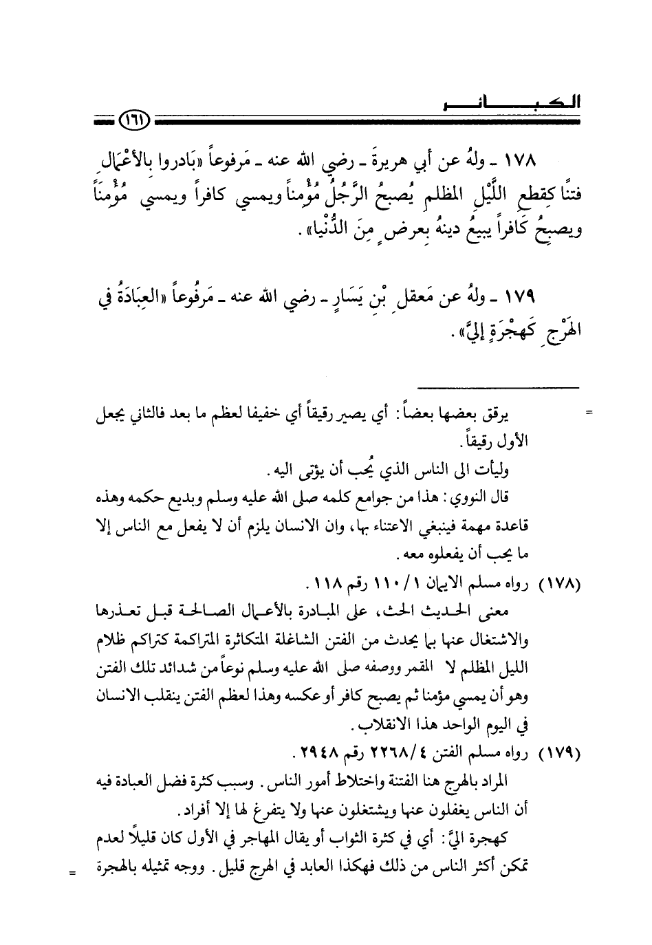 178 - وله عن أبي هريرة - رضي الله عنه - مرفوعا «بادروا بالأعمال فتنا كقطع الليل المظلم يصبح الرجل مؤمنا ويمسي كافرا ويمسي مؤمنا ويصبح كافرا يبيع دينه بعرض من الدنيا» .