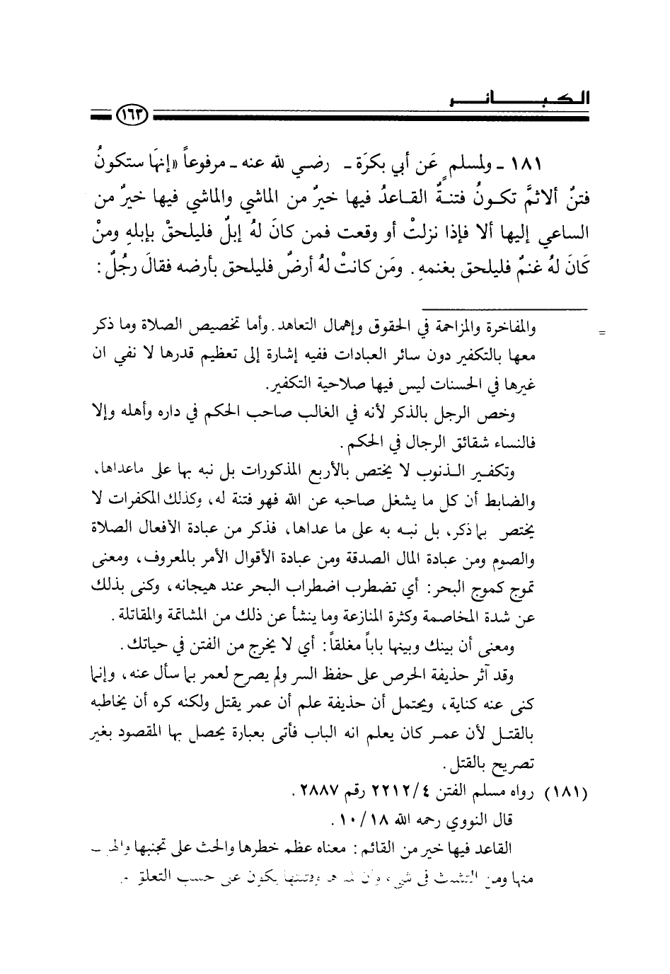 181 - ولمسلم عن أبي بكرة - رضي الله عنه - مرفوعا «إنها ستكون فتن ألا ثم تكون فتنة القاعد فيها خير من الماشي والماشي فيها خير من الساعي إليها ألا فإذا نزلت أو وقعت فمن كان له إبل فليلحق بإبله ومن كان له غنم فليلحق بغنمه. ومن كانت له أرض فليلحق بأرضه فقال رجل» :