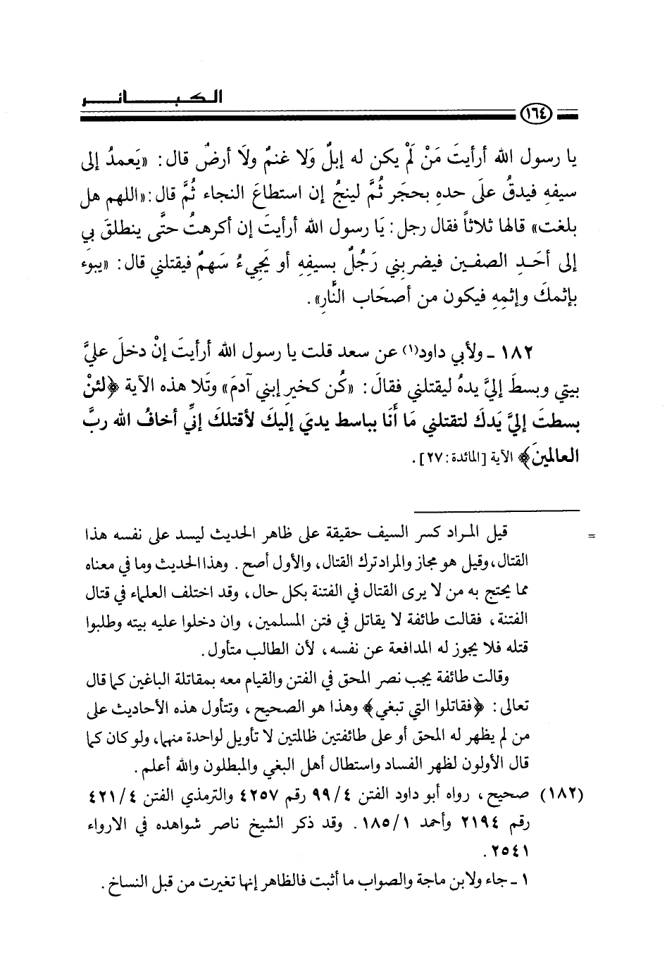 (182) صحيح، رواه أبو داود الفتن 4 / 99 رقم 4257 والترمذي الفتن 4 / 421 رقم 2194 وأحمد 1 / 185. وقد ذكر الشيخ ناصر شواهده في الإرواء 2541.