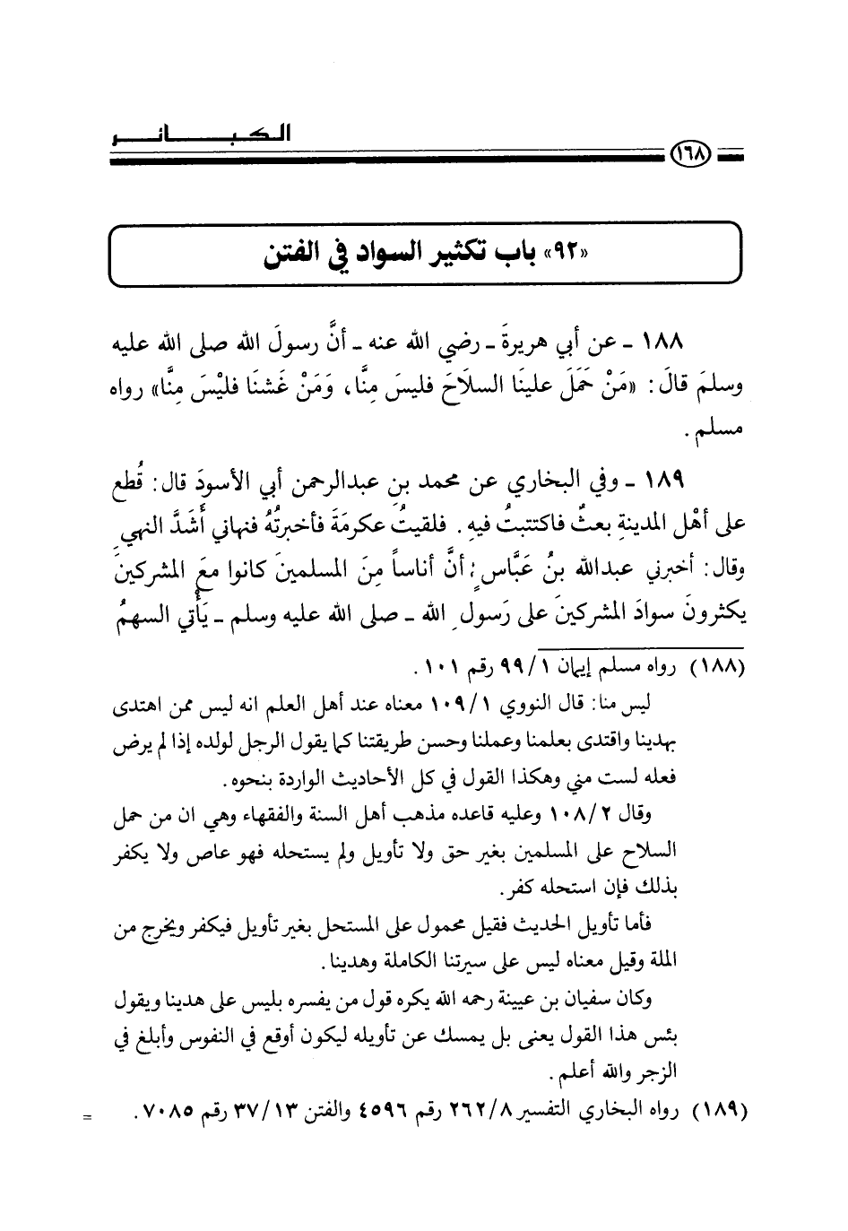 " 92 "باب تكثير السواد في الفتن 188 - عن أبي هريرة - رضي الله عنه - أن رسول الله صلى الله عليه وسلم قال: " «من حمل علينا السلام فليس منا، ومن غشنا فليس منا» رواه مسلم.