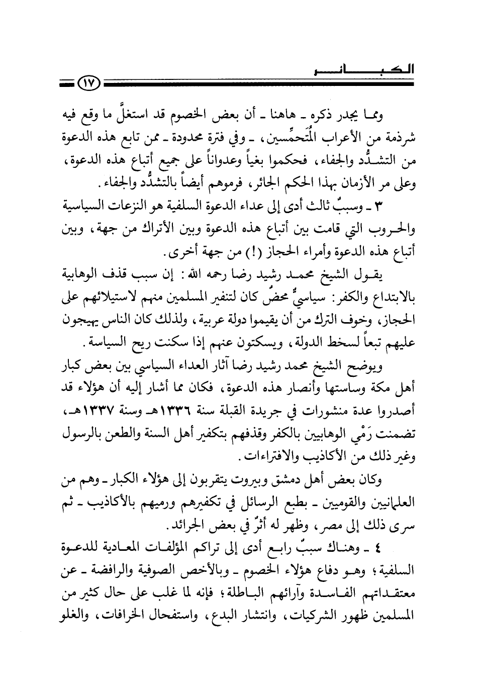 وكان بعض أهل دمشق وبيروت يتقربون إلى هؤلاء الكبار - وهم من العلمانيين والقوميين - بطبع الرسائل في تكفيرهم ورميهم بالأكاذيب - ثم سرى ذلك إلى مصر، وظهر له أثر في بعض الجرائد.