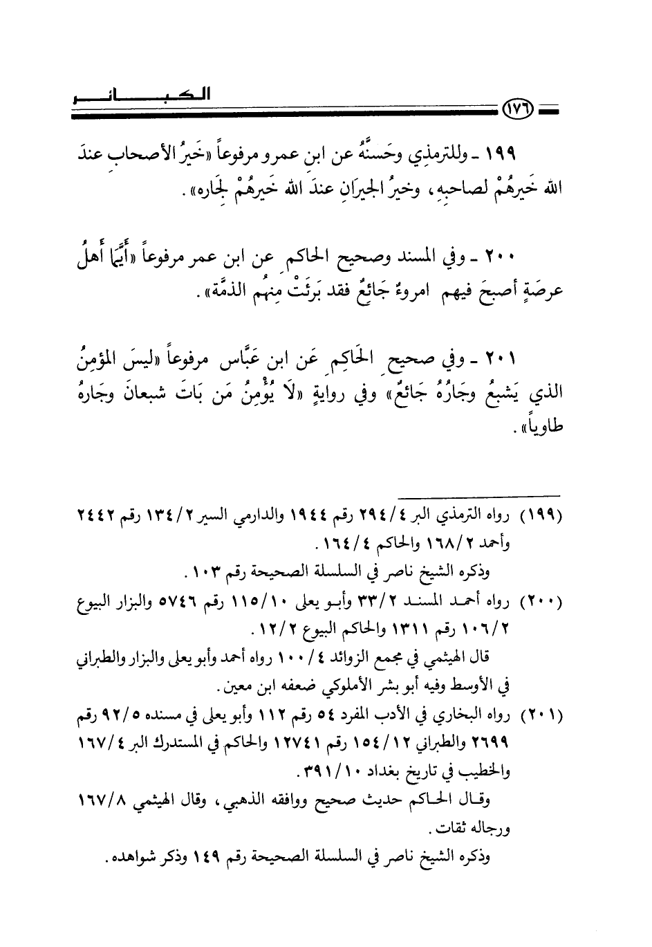201 - وفي صحيح الحاكم عن ابن عباس مرفوعا «ليس المؤمن الذي يشبع وجاره جائع» وفي رواية «لا يؤمن من بات شبعان وجاره طاويا» .