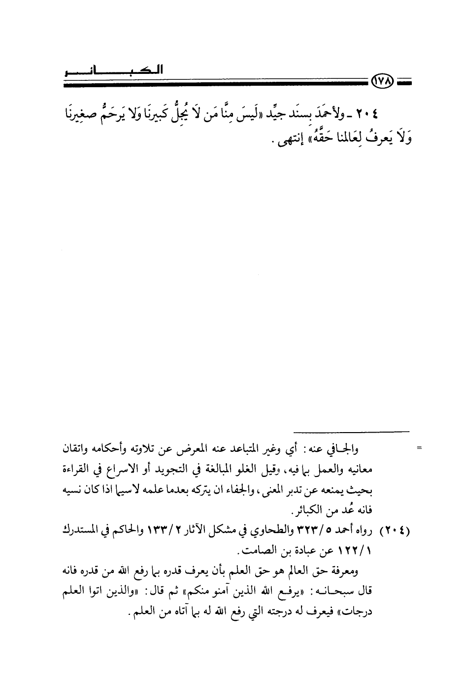 204 - ولأحمد بسند جيد «ليس منا من لا يجل كبيرنا ولا يرحم صغيرنا ولا يعرف لعالمنا حقه» انتهى.