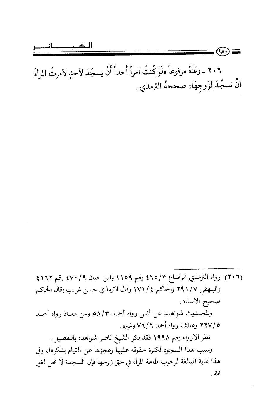 206 - وعنه مرفوعا «لو كنت آمرا أحدا أن يسجد لأحد لأمرت المرأة أن تسجد لزوجها» صححه الترمذي.