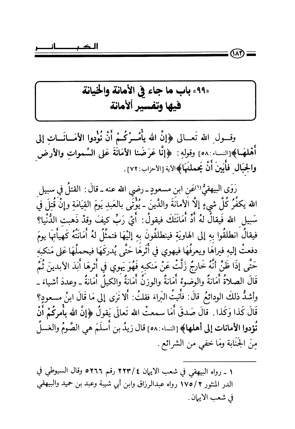 فيها وتفسير الأمانة وقول الله تعالى {إِنَّ اللَّهَ يَأْمُرُكُمْ أَنْ تُؤَدُّوا الْأَمَانَاتِ إِلَى أَهْلِهَا} وقوله: {إِنَّا عَرَضْنَا الْأَمَانَةَ عَلَى السَّمَاوَاتِ وَالْأَرْضِ وَالْجِبَالِ فَأَبَيْنَ أَنْ يَحْمِلْنَهَا} الآية [الأحزاب: 72] .