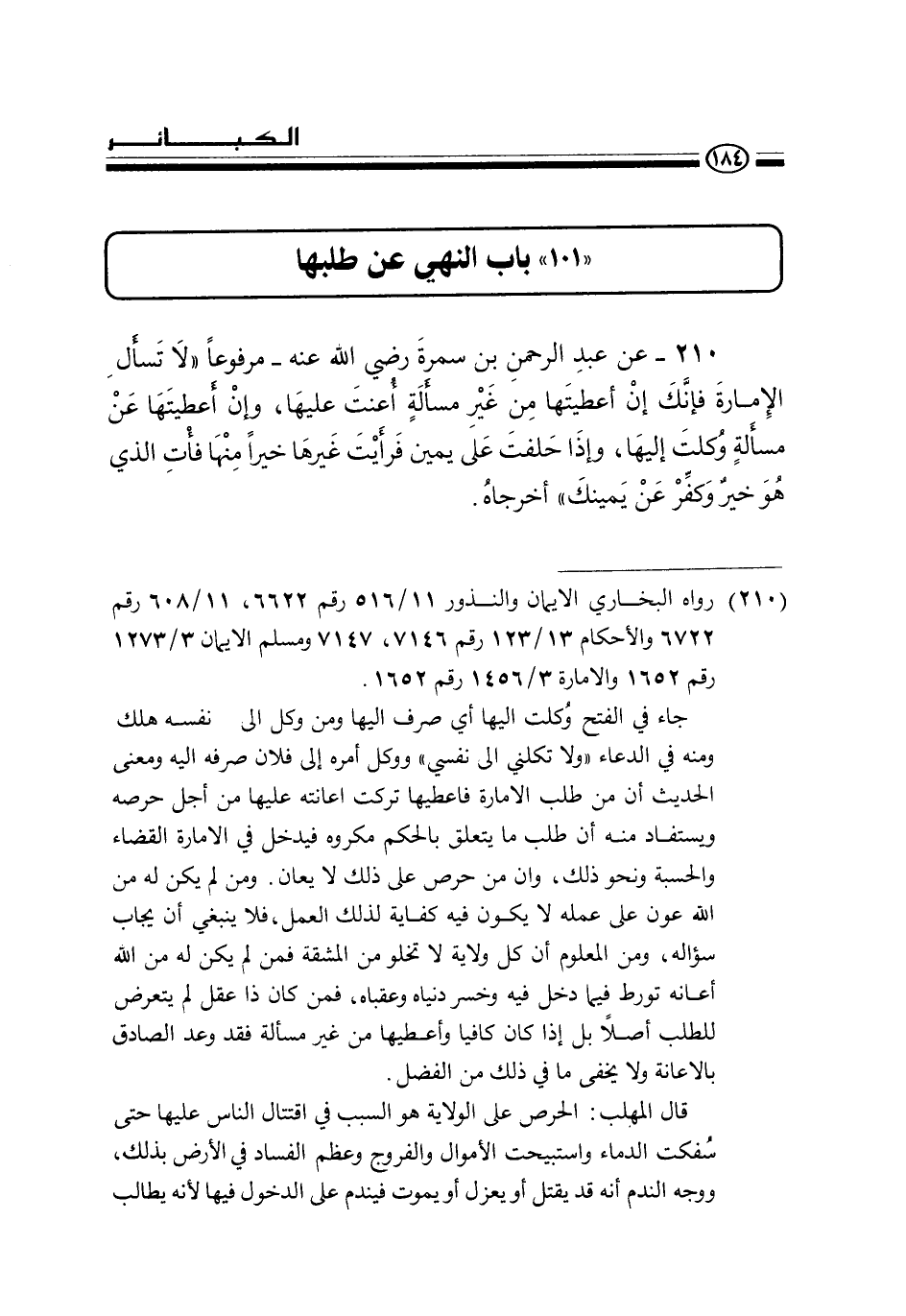 210 - عن عبد الرحمن بن سمرة رضي الله عنه - مرفوعا «لا تسأل الإمارة فأنك إن أعطيتها من غير مسألة أعنت عليها، وإن أعطيتها عن مسألة وكلت إليها، وإذا حلفت على يمين فرأيت غيرها خيرا منها فأت الذي هو خير وكفر عن يمينك» أخرجاه.