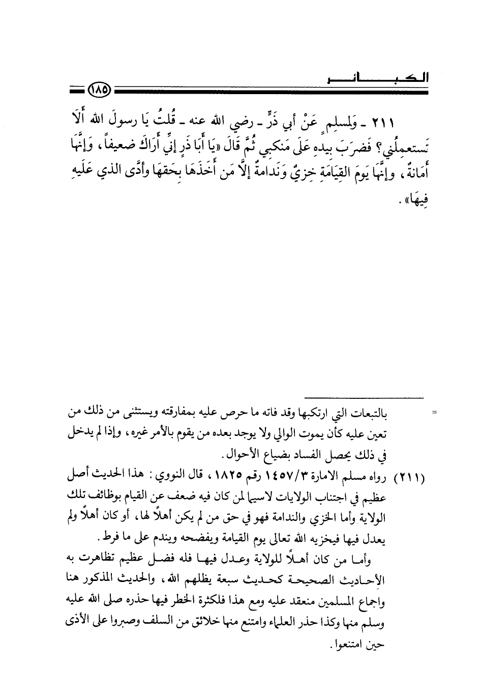 (211) رواه مسلم الإمارة 13 / 1457 رقم 1825، قال النووي: هذا الحديث أصل عظيم في اجتناب الولايات لا سيما لمن كان فيه ضعف عن القيام بوظائف تلك الولاية وأما الخزي والندامة فهو في حق من لم يكن أهلا لها، أو كان أهلا ولم يعدل فيها فيخزيه الله تعالى يوم القيامة ويفضحه ويندم على ما فرط.