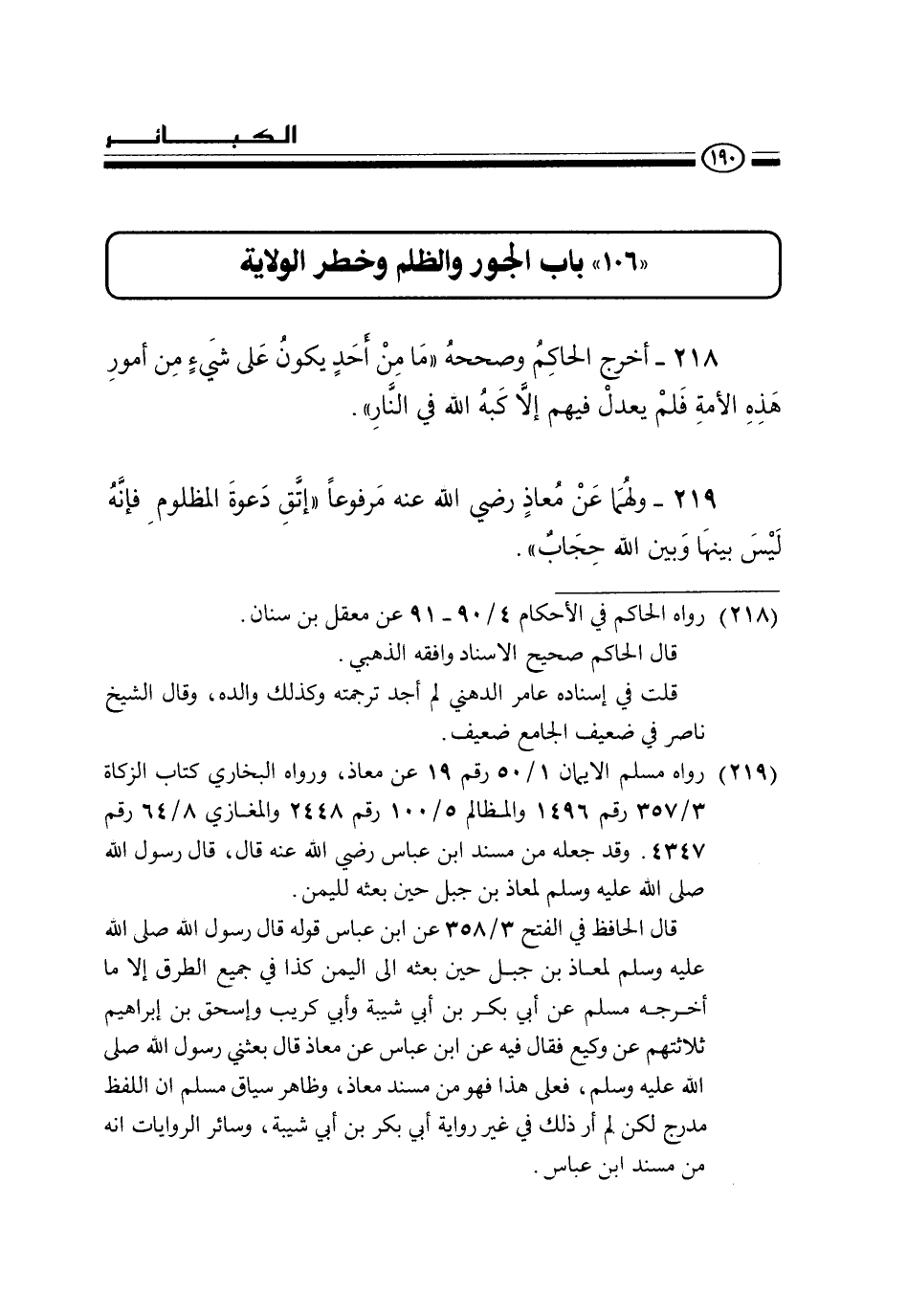 218 - أخرج الحاكم وصححه «ما من أحد يكون على شيء من أمور هذه الأمة فلم يعدل فيهم إلا كبه الله في النار» .