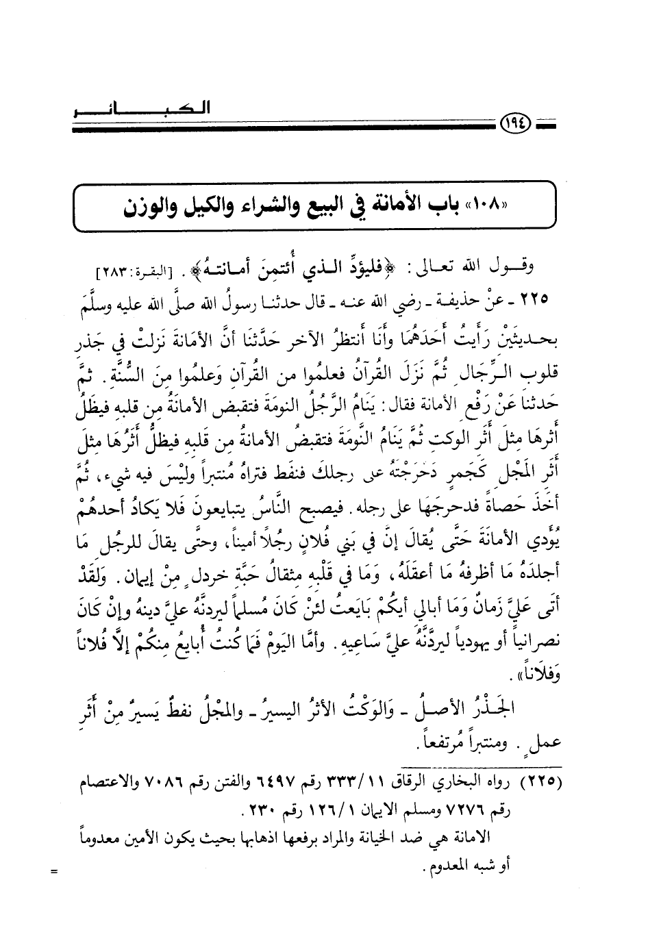 225 - عن حذيفة - رضي الله عنه - «قال حدثنا رسول الله صلى الله عليه وسلم بحديثين رأيت أحدهما وأنا أنتظر الآخر حدثنا أن الأمانة نزلت في جذر قلوب الرجال ثم نزل القرآن فعلموا من القرآن وعلموا من السنة. ثم حدثنا عن رفع الأمانة فقال: ينام الرجل النومة فتقبض الأمانة من قلبه فيظل أثرها مثل أثر الوكت ثم ينام النومة فتقبض الأمانة من قلبه فيظل أثرها مثل أثر المجل كجمر دحرجها على رجلك فنفط فتراه منتبرا وليس فيه شيء، ثم أخذ حصاة فدحرجها على رجله. فيصبح الناس يتبايعون فلا يكاد أحدهم يودي الأمانة حتى يقال إن في بني فلان رجلا أمينا، وحتى يقال للرجل ما أجلده ما أظرفه ما أعقله، وما في قلبه مثقال حبة خردل من إيمان. ولقد أتى علي زمان وما أبالي أيكم بايعت لئن كان مسلما ليردنه علي دينه وإن كان نصرانيا أو يهوديا ليردنه علي ساعيه. وأما اليوم فما كنت أبايع منكم إلا فلانا وفلانا» .