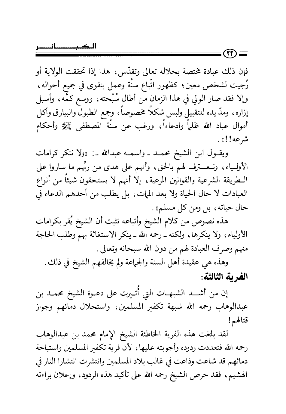ويقول ابن الشيخ محمد - واسمه عبد الله -: " ولا ننكر كرامات الأولياء، ونعترف لهم بالحق، وأنهم على هدى من ربهم ما ساروا على الطريقة الشرعية والقوانين المرعية، إلا أنهم لا يستحقون شيئا من أنواع العبادات لا حال الحياة ولا بعد ممات، بل يطلب من أحدهم الدعاء في حال حياته، بل ومن كل مسلم ".