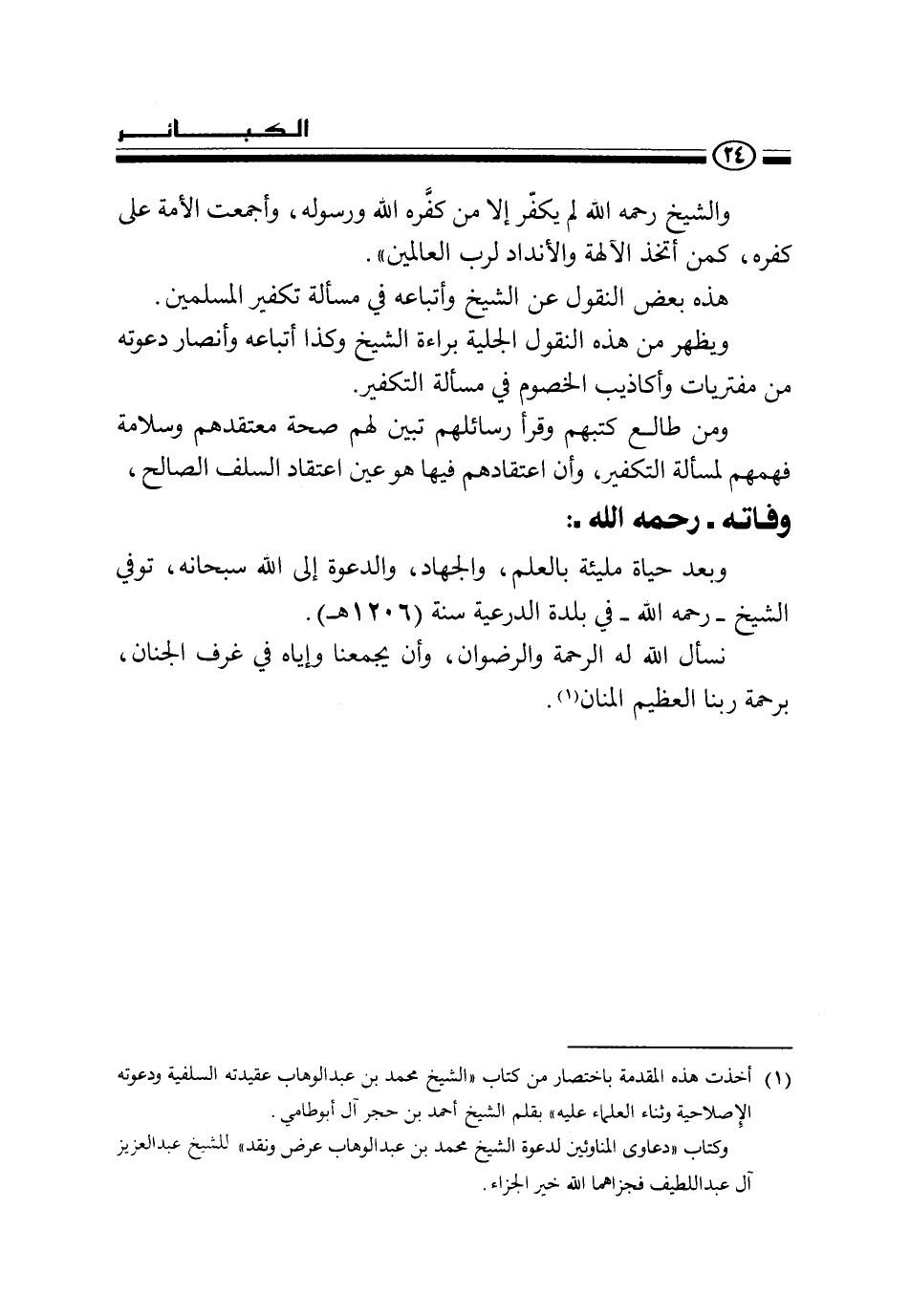 ويظهر من هذه النقول الجلية براءة الشيخ وكذا أتباعه وأنصار دعوته من مفتريات وأكاذيب الخصوم في مسألة التكفير.