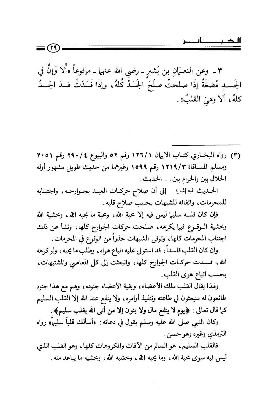 3 - وعن النعمان بن بشير - رضي الله عنهما - مرفوعا «ألا وإن في الجسد مضغة إذا صلحت صلح الجسد كله، وإذا فسدت فسد الجسد كله، ألا وهي القلب» .