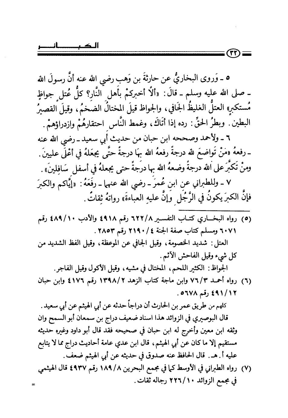 5 - روى البخاري عن حارثة بن وهب رضي الله عنه أن رسول الله - صلى الله عليه وسلم - قال: «ألا أخبركم بأهل النار؟ كل عُتُلٍّ جواظ مستكبر» العتل الغليظ الجافي، والجواظ قيل المختال الضخم، وقيل القصير البطين، وبطر الحق: رده إذا أتاك، وغمط الناس احتقارهم وازدراؤهم.