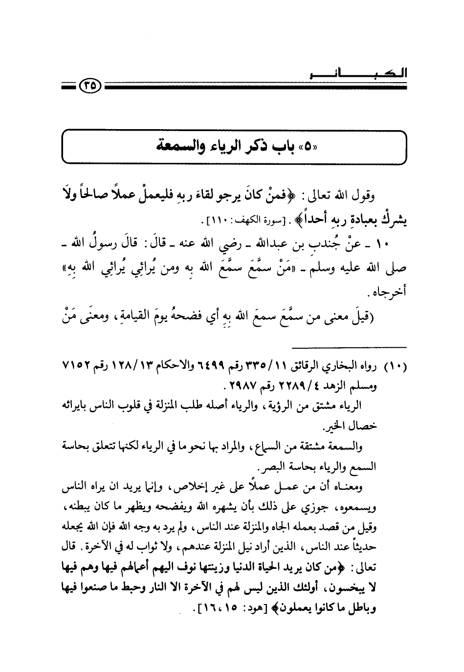 " 5 " باب ذكر الرياء والسمعة وقول الله تعالى: {فَمَنْ كَانَ يَرْجُوا لِقَاءَ رَبِّهِ فَلْيَعْمَلْ عَمَلا صَالِحًا وَلا يُشْرِكْ بِعِبَادَةِ رَبِّهِ أَحَدًا}