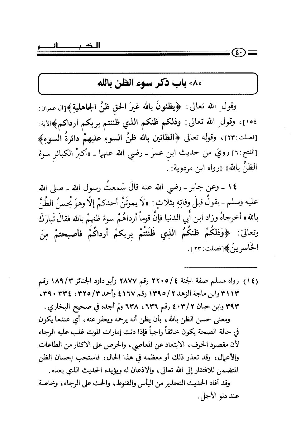 " 8 " باب ذكر سوء الظن بالله وقول الله تعالى: {يَظُنُّونَ بِاللَّهِ غَيْرَ الْحَقِّ ظَنَّ الْجَاهِلِيَّةِ} وقول الله تعالى: {وَذَلِكُمْ ظَنُّكُمُ الَّذِي ظَنَنْتُمْ بِرَبِّكُمْ أَرْدَاكُمْ} الآية: [فصلت: 23] ، وقوله تعالى {الظَّانِّينَ بِاللَّهِ ظَنَّ السَّوْءِ عَلَيْهِمْ دَائِرَةُ السَّوْءِ} روي من حديث ابن عمر - رضي الله عنهما - «أكبر الكبائر سوء الظن بالله» رواه ابن مردويه ".