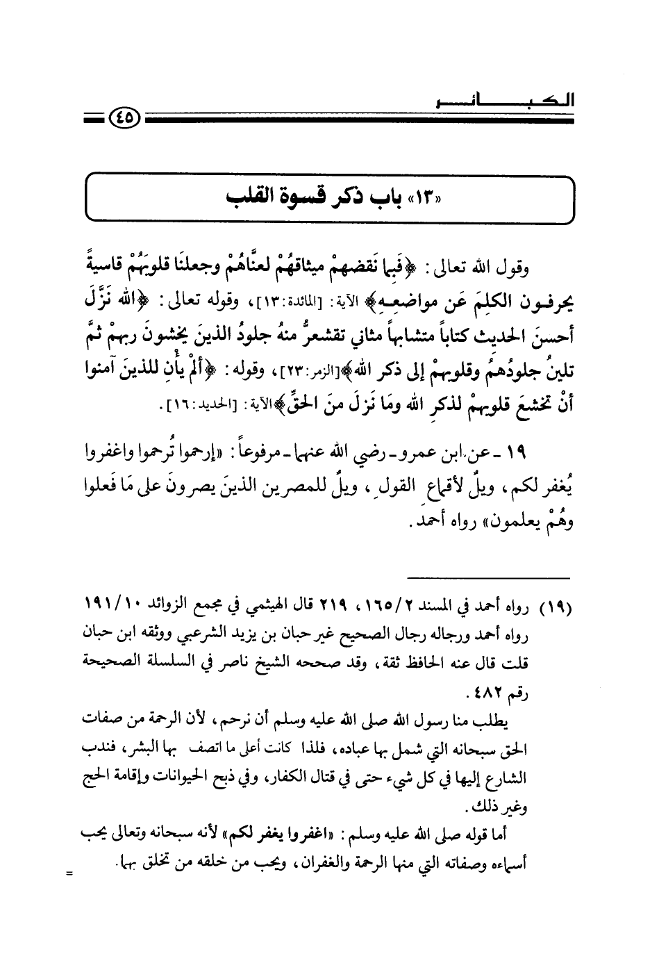 " 13 " باب ذكر قسوة القلب وقول الله تعالى: {فَبِمَا نَقْضِهِمْ مِيثَاقَهُمْ لَعَنَّاهُمْ وَجَعَلْنَا قُلُوبَهُمْ قَاسِيَةً يُحَرِّفُونَ الْكَلِمَ عَنْ مَوَاضِعِهِ} الآية: [المائدة: 13] ، وقوله تعالى: {اللَّهُ نَزَّلَ أَحْسَنَ الْحَدِيثِ كِتَابًا مُتَشَابِهًا مَثَانِيَ تَقْشَعِرُّ مِنْهُ جُلُودُ الَّذِينَ يَخْشَوْنَ رَبَّهُمْ ثُمَّ تَلِينُ جُلُودُهُمْ وَقُلُوبُهُمْ إِلَى ذِكْرِ اللَّهِ} وقوله: {أَلَمْ يَأْنِ لِلَّذِينَ آمَنُوا أَنْ تَخْشَعَ قُلُوبُهُمْ لِذِكْرِ اللَّهِ وَمَا نَزَلَ مِنَ الْحَقِّ} الآية: [الحديد: 16] .