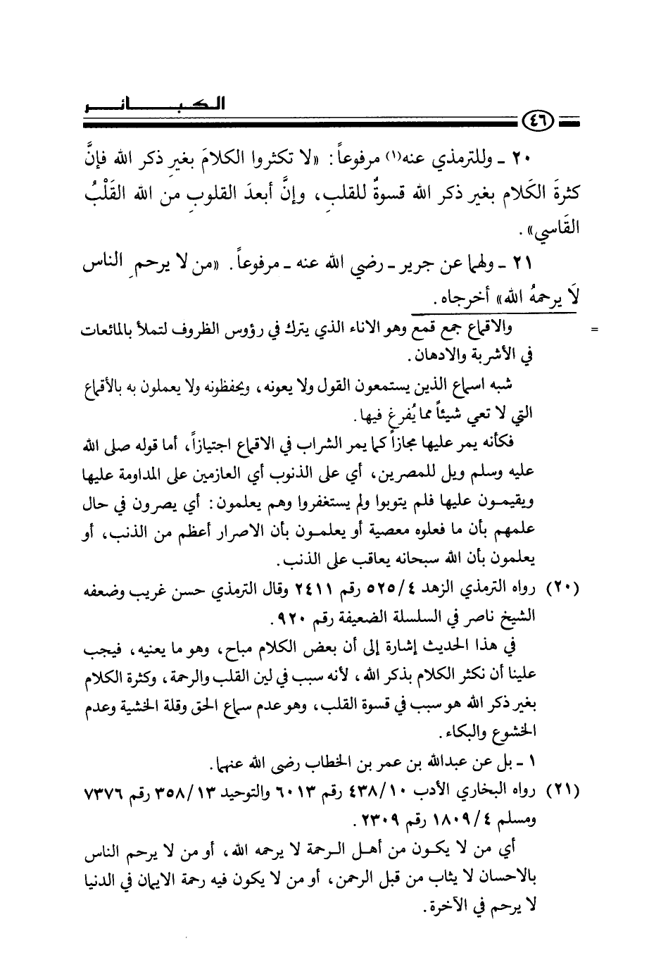 20 - وللترمذي عنه (¬1) . مرفوعا: «لا تكثروا الكلام بغير ذكر الله فإن كثرة الكلام بغير ذكر الله قسوة للقلب، وإن أبعد القلوب من الله القلب القاسي» .
