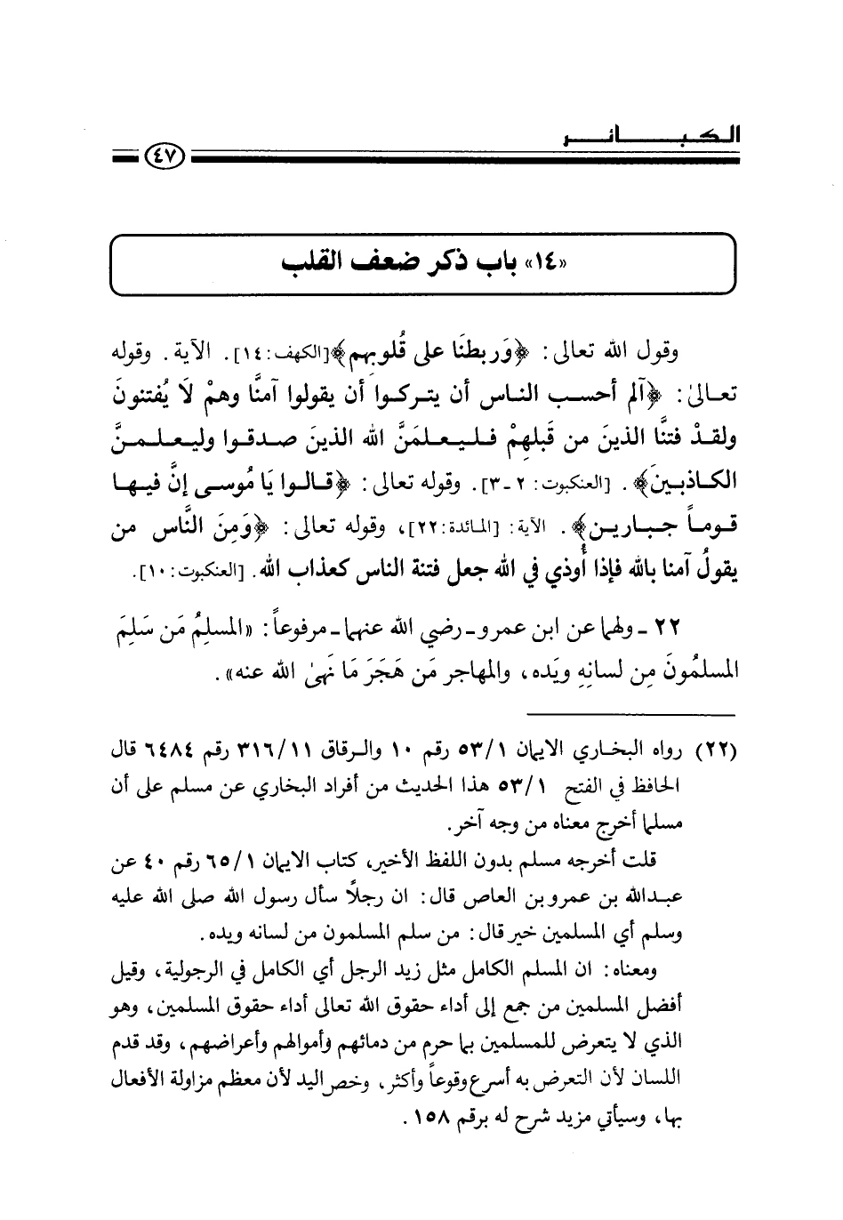 " 14 " باب ذكر ضعف القلب وقول الله تعالى: {وَرَبَطْنَا عَلَى قُلُوبِهِمْ} الآية. وقوله تعالى: {أَحَسِبَ النَّاسُ أَنْ يُتْرَكُوا أَنْ يَقُولُوا آمَنَّا وَهُمْ لا يُفْتَنُونَ - وَلَقَدْ فَتَنَّا الَّذِينَ مِنْ قَبْلِهِمْ فَلَيَعْلَمَنَّ اللَّهُ الَّذِينَ صَدَقُوا وَلَيَعْلَمَنَّ الْكَاذِبِينَ} وقوله تعالى: {قَالُوا يَا مُوسَى إِنَّ فِيهَا قَوْمًا جَبَّارِينَ} وقوله تعالى: {وَمِنَ النَّاسِ مَنْ يَقُولُ آمَنَّا بِاللَّهِ فَإِذَا أُوذِيَ فِي اللَّهِ جَعَلَ فِتْنَةَ النَّاسِ كَعَذَابِ اللَّهِ}