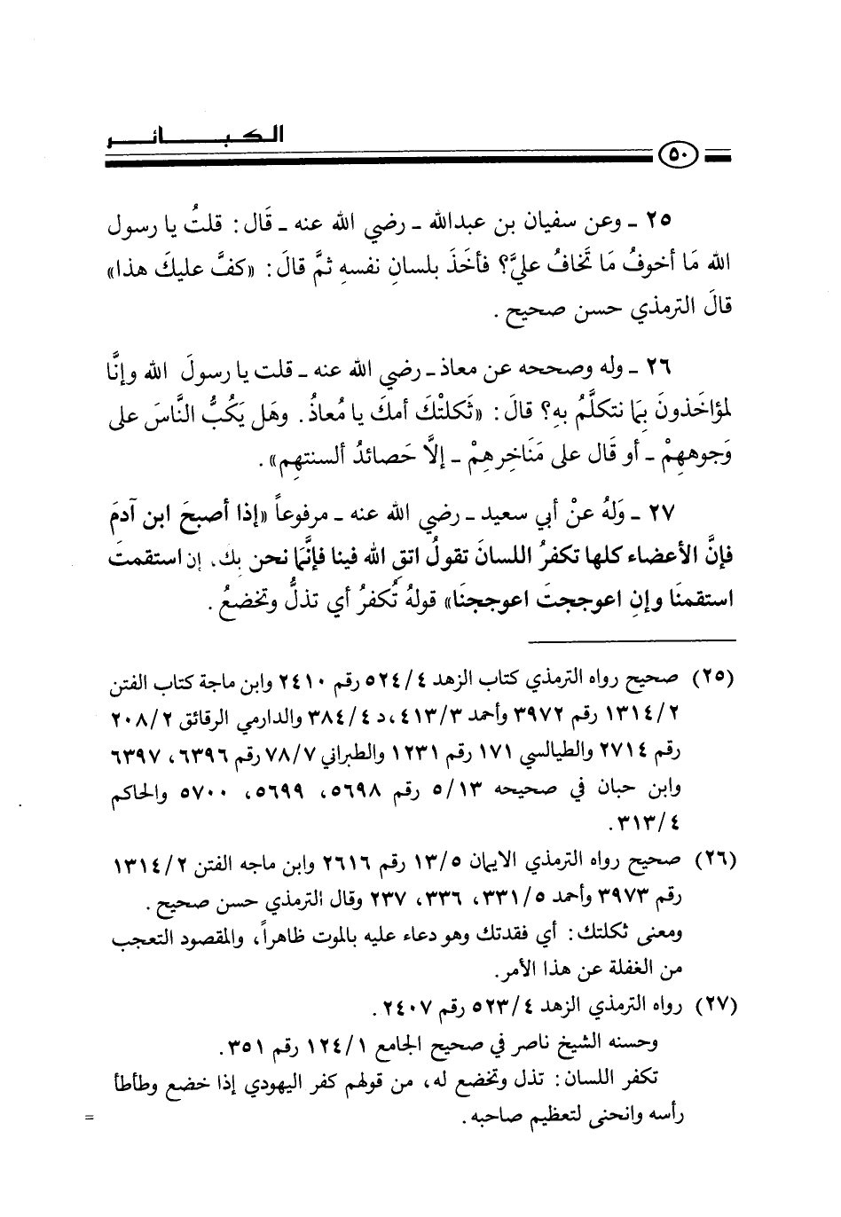 25 - «وعن سفيان بن عبد الله - رضي الله عنه - قال: قلت يا رسول الله ما أخوف ما تخاف علي؟ فأخذ بلسان نفسه ثم قال: " كف عليك هذا» قال الترمذي حسن صحيح.