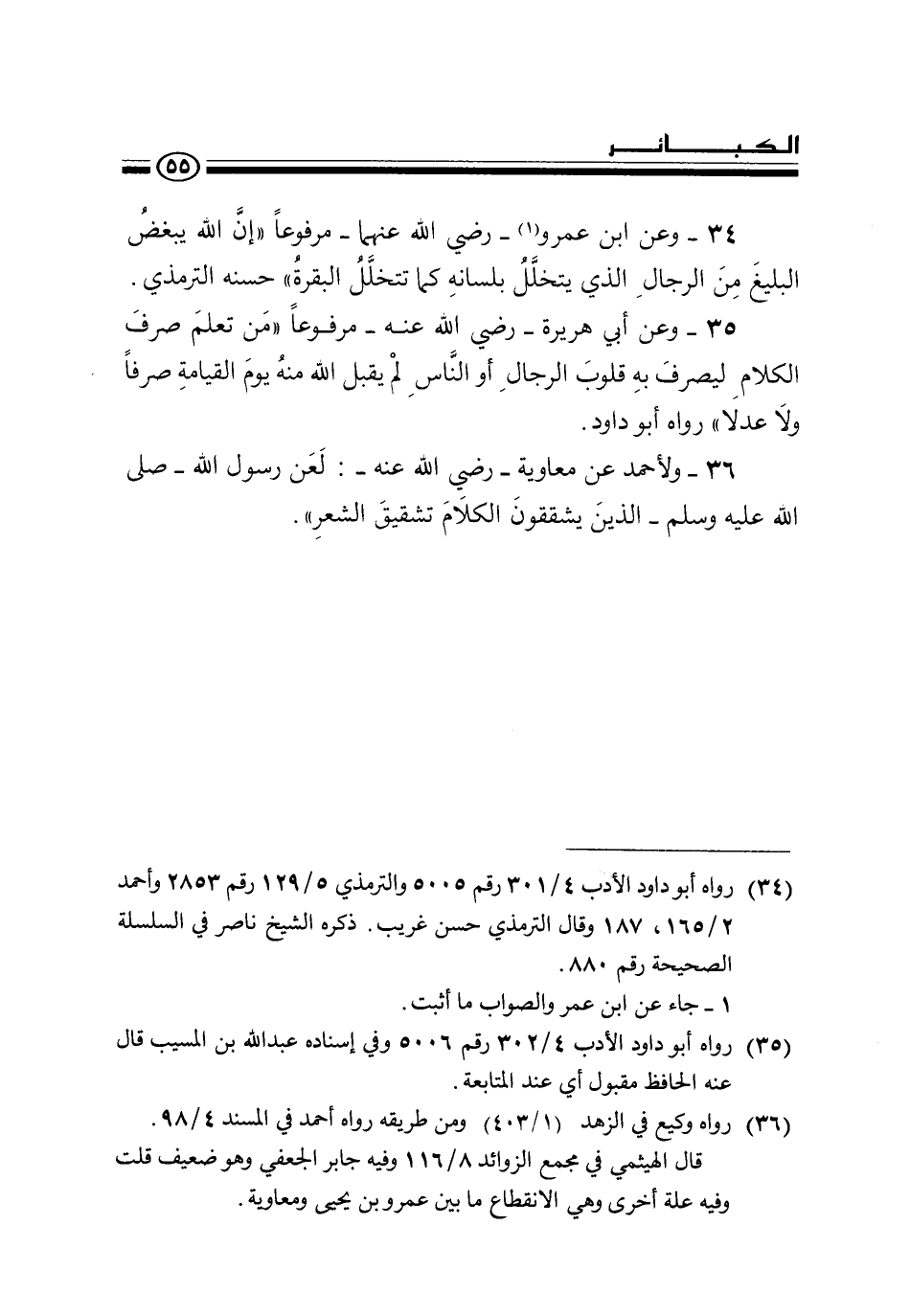 (34) رواه أبو داود الأدب 4 / 301 رقم 5005 والترمذي 5 / 129 رقم 2853 وأحمد 2 / 165، 187 وقال الترمذي حسن غريب. ذكره الشيخ ناصر في السلسلة الصحيحة رقم 880.