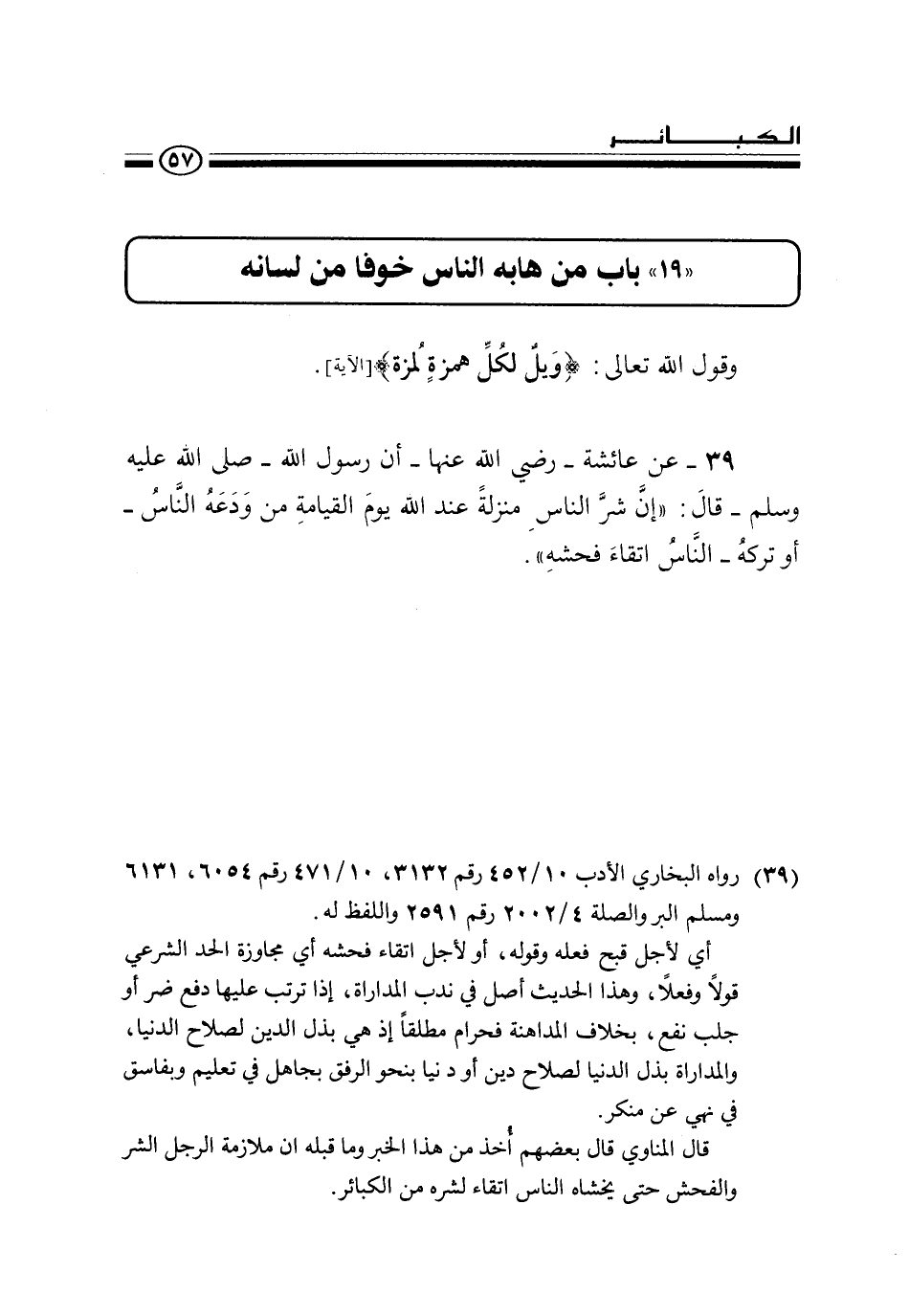 " 19 " باب من هابه الناس خوفا من لسانه وقول الله تعالى: {وَيْلٌ لِكُلِّ هُمَزَةٍ لُمَزَةٍ}
