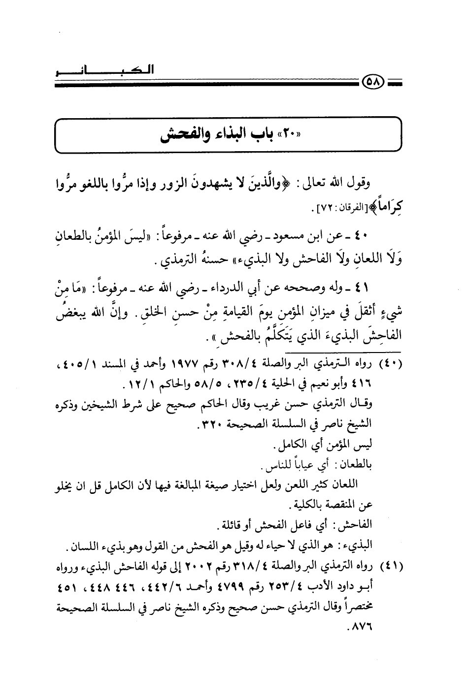 " 20 " باب البذاء والفحش وقول الله تعالى: {وَالَّذِينَ لَا يَشْهَدُونَ الزُّورَ وَإِذَا مَرُّوا بِاللَّغْوِ مَرُّوا كِرَامًا}