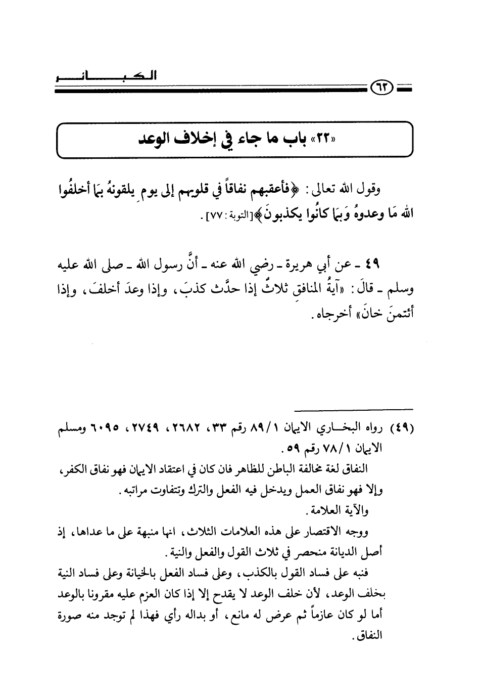 " 22 " باب ما جاء في إخلاف الوعد وقول الله تعالى: {فَأَعْقَبَهُمْ نِفَاقًا فِي قُلُوبِهِمْ إِلَى يَوْمِ يَلْقَوْنَهُ بِمَا أَخْلَفُوا اللَّهَ مَا وَعَدُوهُ وَبِمَا كَانُوا يَكْذِبُونَ}