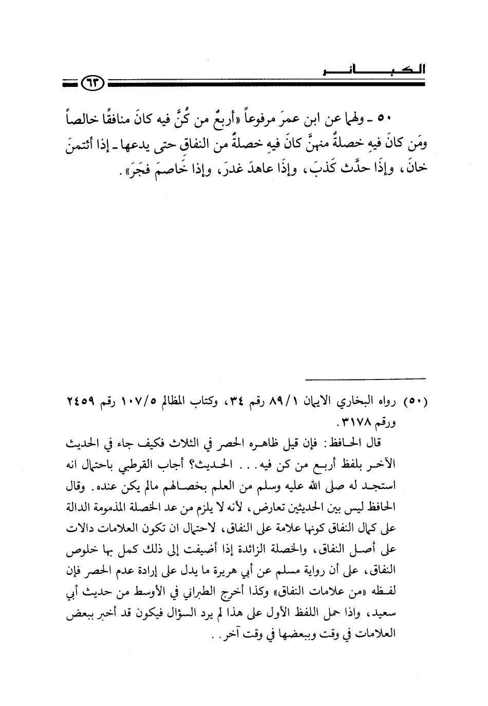 50 - ولهما عن ابن عمر مرفوعا «أربع من كن فيه كان منافقا خالصا ومن كان فيه خصلة منهن كان فيه خصلة من النفاق حتى يدعها - إذا اؤتمن خان، وإذا حدث كذب، وإذا عاهد غدر، وإذا خاصم فجر» ".