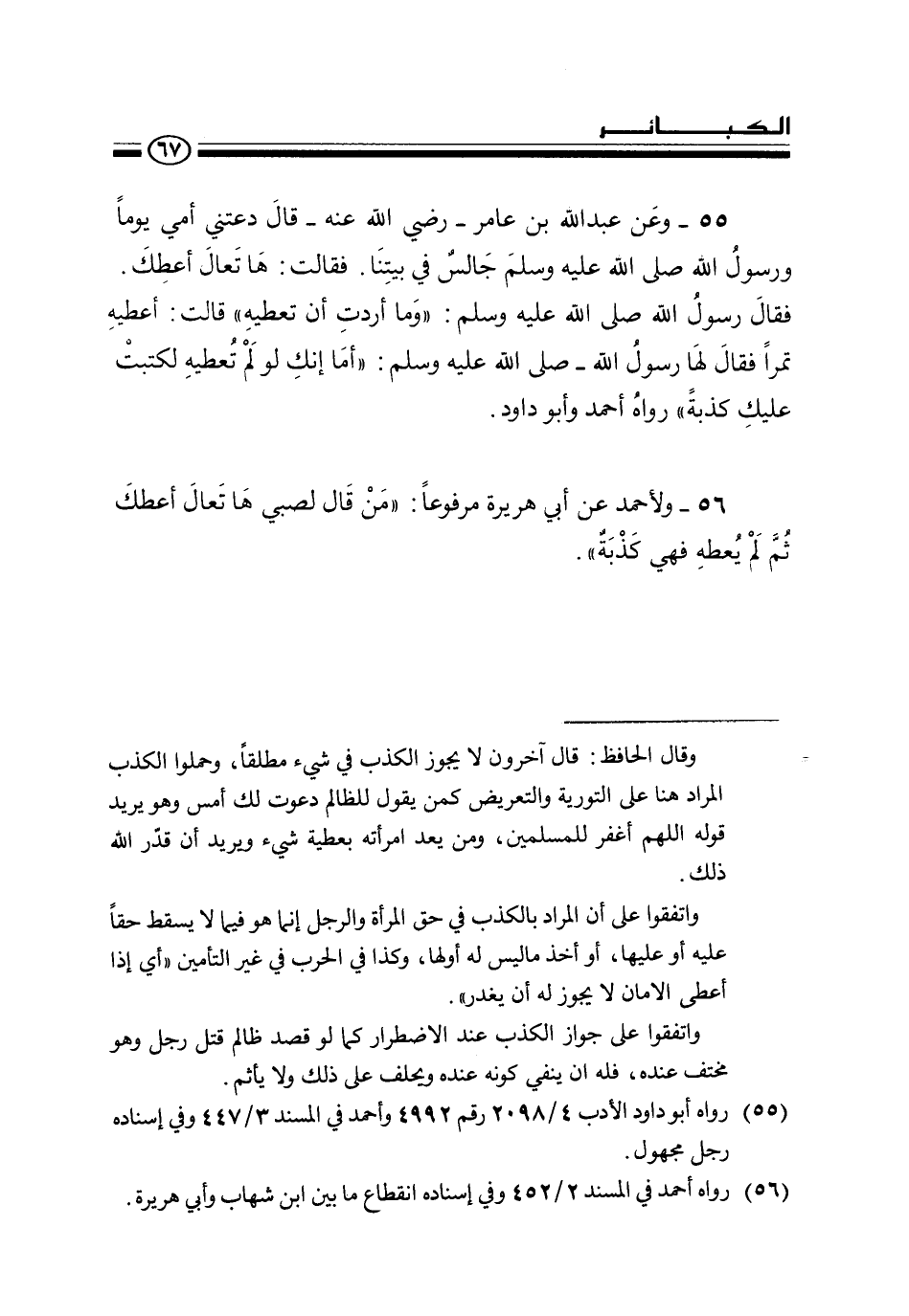 55 - «وعن عبد الله بن عامر - رضي الله عنه - قال دعتني أمي يوما ورسول الله صلى الله عليه وسلم جالس في بيتنا. فقالت: ها تعال أعطك. فقال رسول الله صلى الله عليه وسلم: " وما أردت أن تعطيه " قالت: أعطيه تمرا فقال لها رسول الله - صلى الله عليه وسلم: " أما إنك لو لم تعطيه لكتبت عليك كذبة» رواه أحمد وأبو داود.