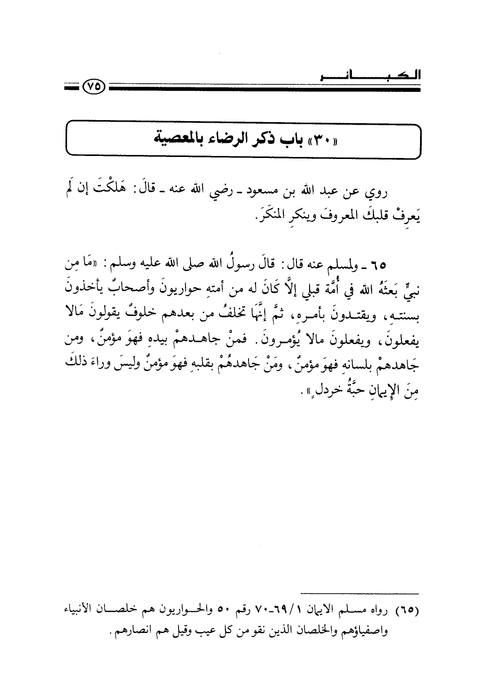 " 30 " باب ذكر الرضا بالمعصية روي عن عبد الله بن مسعود - رضي الله عنه - قال: هلكت إن لم يعرف قلبك المعروف وينكر المنكر.