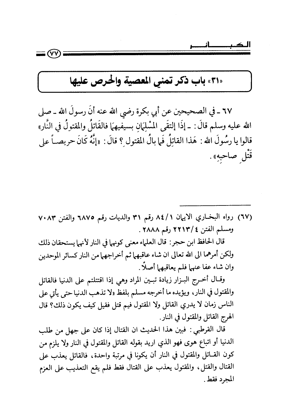 (67) رواه البخاري الإيمان 1 / 84 رقم 31 والديات رقم 6875 والفتن 7083 ومسلم الفتن 4 / 2213 رقم 2888.
