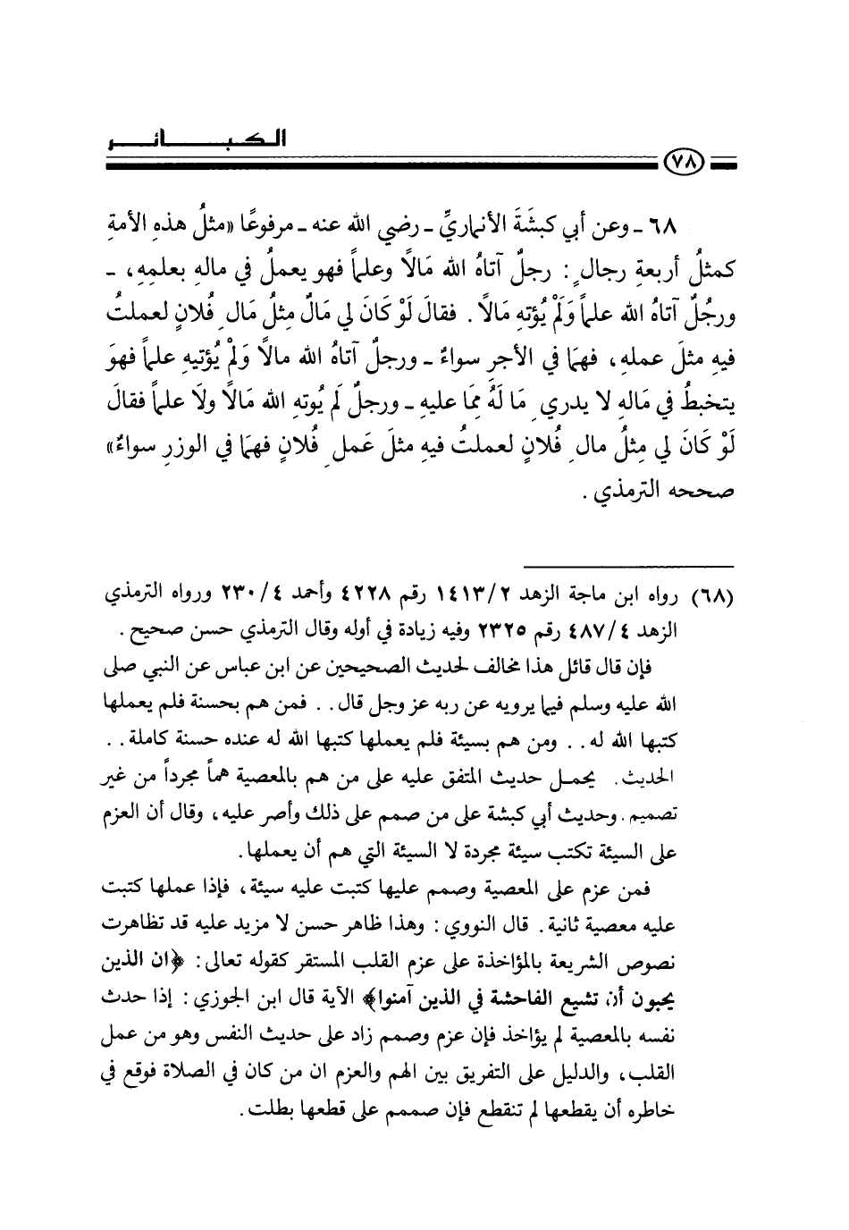68 - وعن أبي كبشة الأنماري - رضي الله عنه - مرفوعا «مثل هذه الأمة كمثل أربعة رجال: رجل آتاه الله مالا وعلما فهو يعمل في ماله بعلمه، ورجل آتاه الله علما ولم يؤته مالا. فقال لو كان لي مال مثل مال فلان لعملت فيه مثل عمله، فهما في الأجر سواء - ورجل آتاه الله مالا ولم يؤته علما فهو يتخبط في ماله لا يدرى ما له مما عليه - ورجل لم يؤته الله مالا ولا علما فقال لو كان لي مثل مال فلان لعملت فيه مثل ما عمل فلان فهما في الوزر سواء» صححه الترمذي.