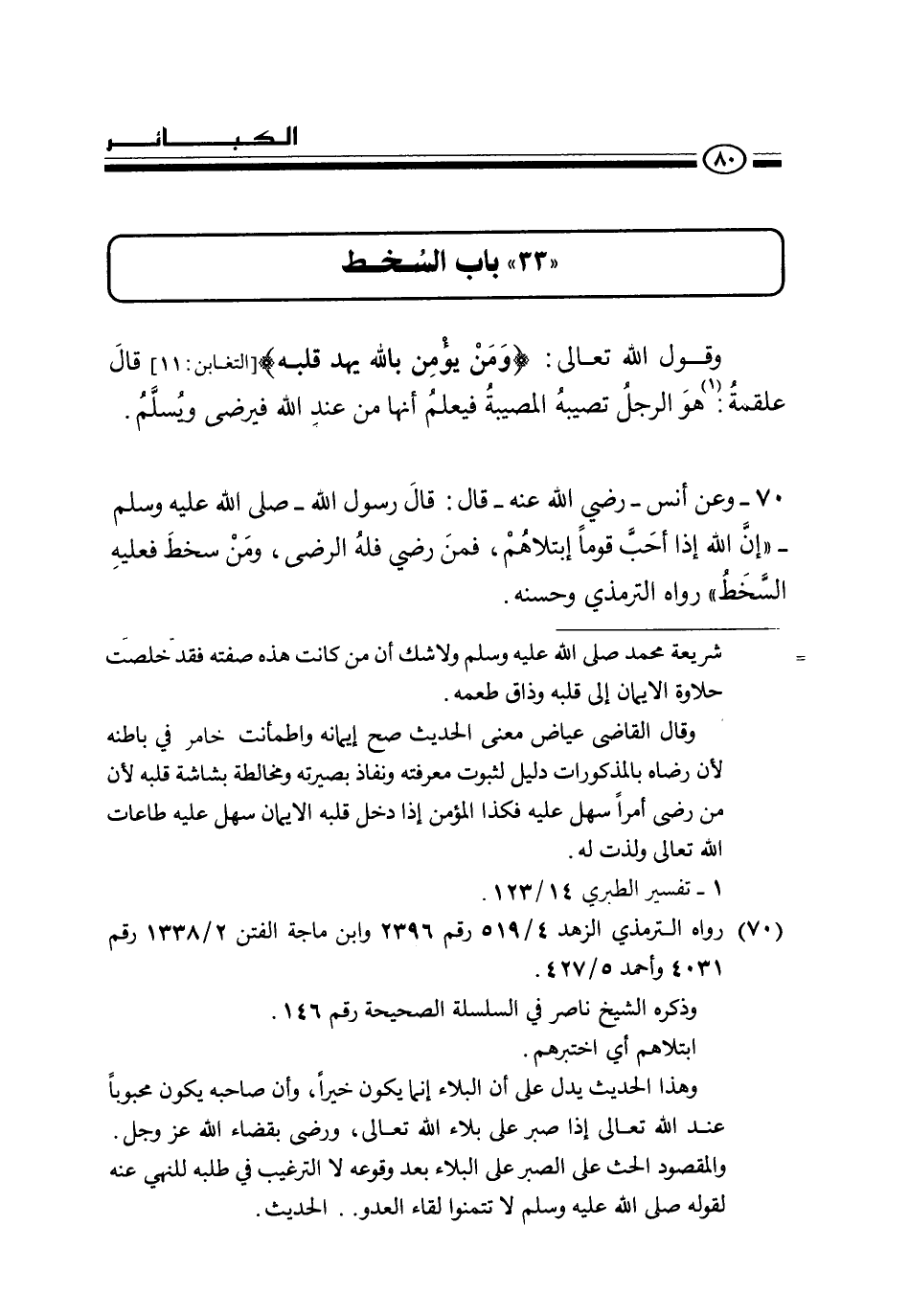 " 33 " باب السخط وقول الله تعالى: {وَمَنْ يُؤْمِنْ بِاللَّهِ يَهْدِ قَلْبَهُ} قال علقمة (¬1) هو الرجل تصيبه المصيبة فيعلم أنها من عند الله فيرضى بها ويسلم.