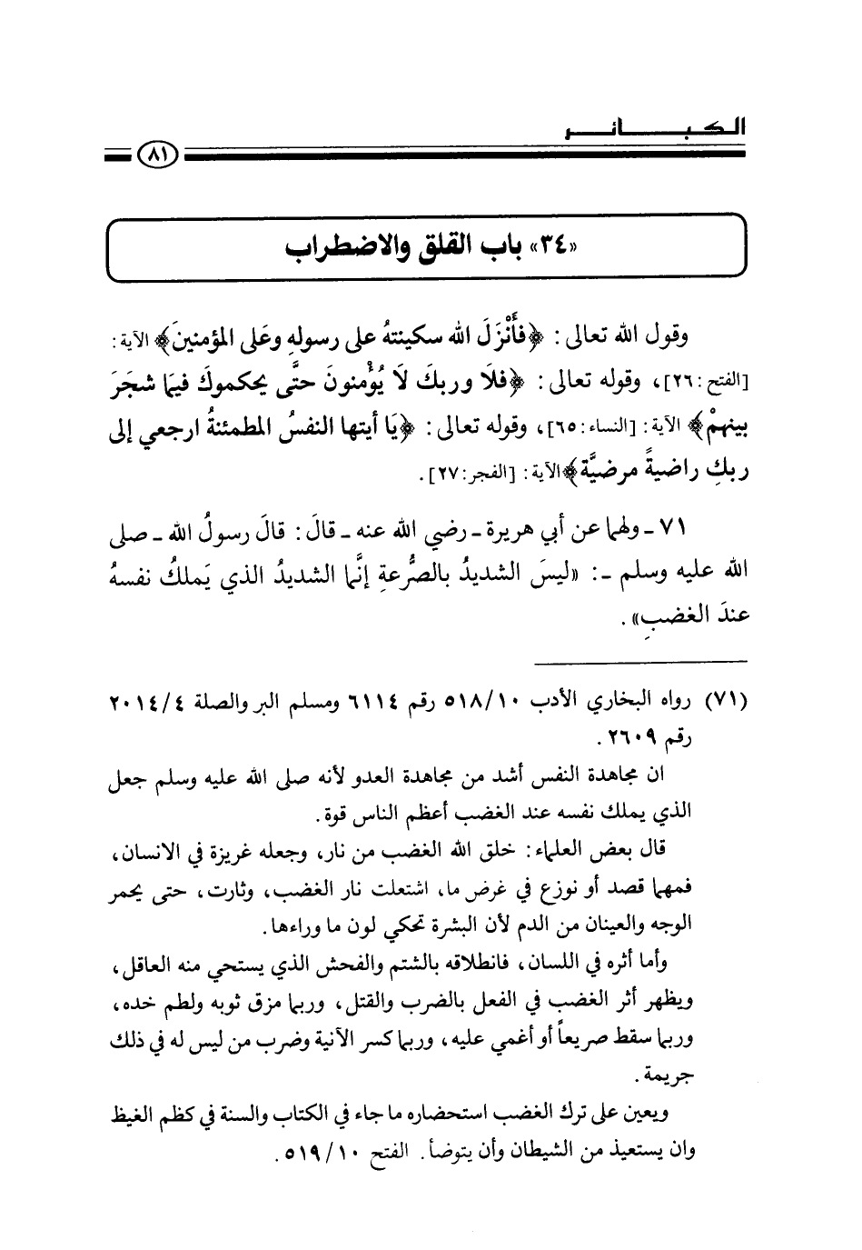 " 34 " باب القلق والاضطراب وقول الله تعالي: {فَأَنْزَلَ اللَّهُ سَكِينَتَهُ عَلَى رَسُولِهِ وَعَلَى الْمُؤْمِنِينَ} الآية: [الفتح: 26] ، وقوله تعالى: {فَلَا وَرَبِّكَ لَا يُؤْمِنُونَ حَتَّى يُحَكِّمُوكَ فِيمَا شَجَرَ بَيْنَهُمْ} الآية: [النساء: 65] ، وقوله تعالى: {يَا أَيَّتُهَا النَّفْسُ الْمُطْمَئِنَّةُ - ارْجِعِي إِلَى رَبِّكِ رَاضِيَةً مَرْضِيَّةً} الآية: [الفجر: 27] .