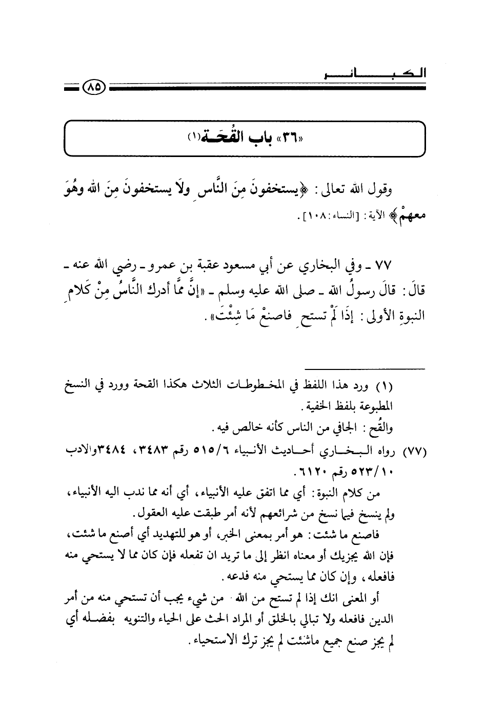 77 - وفي البخاري عن أبي مسعود عقبة بن عمرو - رضي الله عنه - قال: قال رسول الله - صلى الله عليه وسلم - «إن مما أدرك الناس من كلام النبوة الأولى: إذا لم تستح فاصنع ما شئت» .