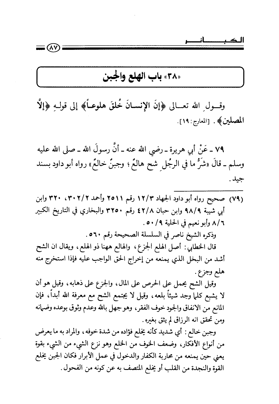 79 - عن أبي هريرة - رضي الله عنه - أن رسول الله - صلى الله عليه وسلم - قال «شر ما في الرجل شح هالع؛ وجبن خالع» رواه أبو داود بسند جيد.